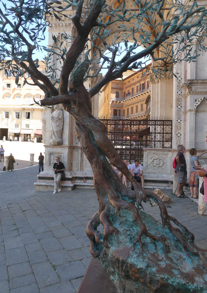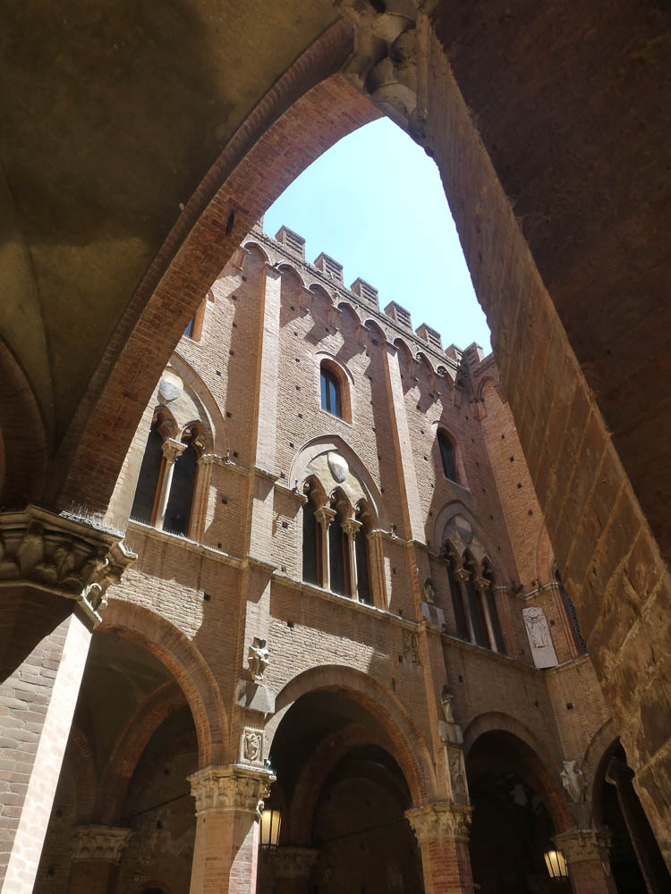 Also schlendern wir Schatten suchend vom Campo zum Dom. Was für ein Gemäuer! Trotz oder vielleicht auch gerade wegen des gleissenden Sonnenlichts ist er ganz einfach spektakulär. Wir marschieren tapfer – Kopf immer im Nacken, weil es so viel Schönes zu sehen gibt – durch Sienas Altstadt, mutmassen, welche Medici und Schlimmere hier ihr Unwesen getrieben haben, sehen in einer Ausstellung mit Schrecken, wie viele Männer in den letzten Jahren beim Palio oder in der Vorbereitung dazu ihr Leben gelassen haben, entschließen uns gegen eine Kugel Eis, weil die vor den Lippen auf dem Hemd gelandet wäre – da ist die Hitze unerbittlich.