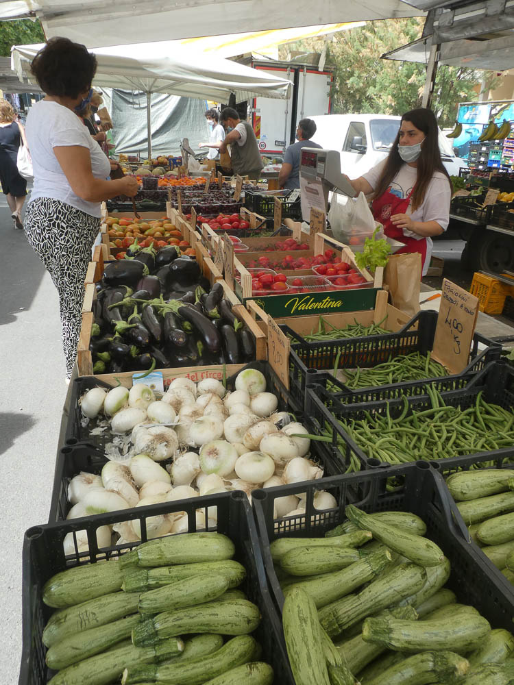 Mittwoch ist Markttag in Bellaria. Das wollen wir uns einmal ansehen. Und tatsächlich treffen wir hier eine Menge Menschen. Die meisten Einheimische, ein paar Touristen. Die Klamottenverkäufer sind fast alle Asiaten. Aber egal, woher sie kommen: Sie sprechen Italienisch, zudem alle englisch, deutsch, französisch… Die Geschäfte stehen noch nicht in voller Blüte. Hinzu kommt, dass es mit 24 Grad nicht so brüllend heiß ist, dass die Sommerfähnchen reißenden Umsatz finden. Es gibt natürlich auch Obst, Käse, Gemüse, Regionales im Angebot, aber wirklich interessant sind Klamotten und Schuhe. Wäre es mit einer Freundin an der Seite. Mit einem Kerl ist das nicht ganz so einfach. Meiner parkt sich im Schatten und versucht, ein nicht-mauliges Gesicht zu machen. Klappt mal mehr, mal weniger.