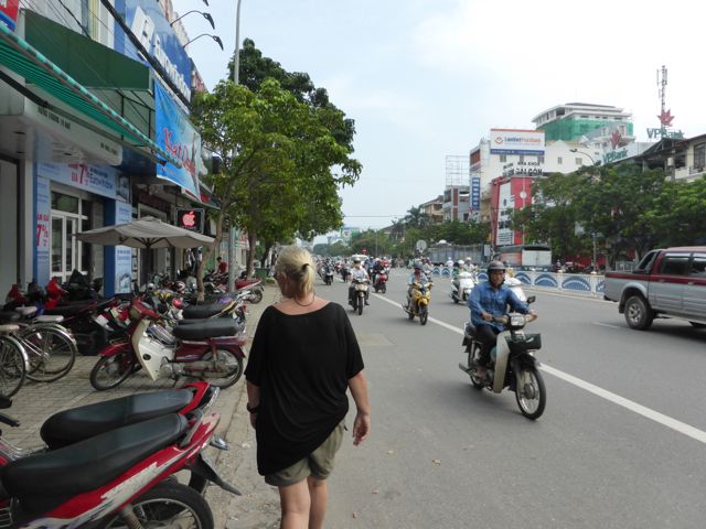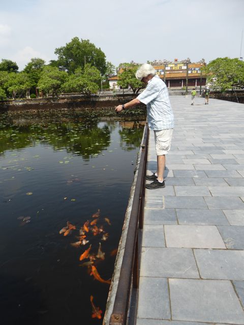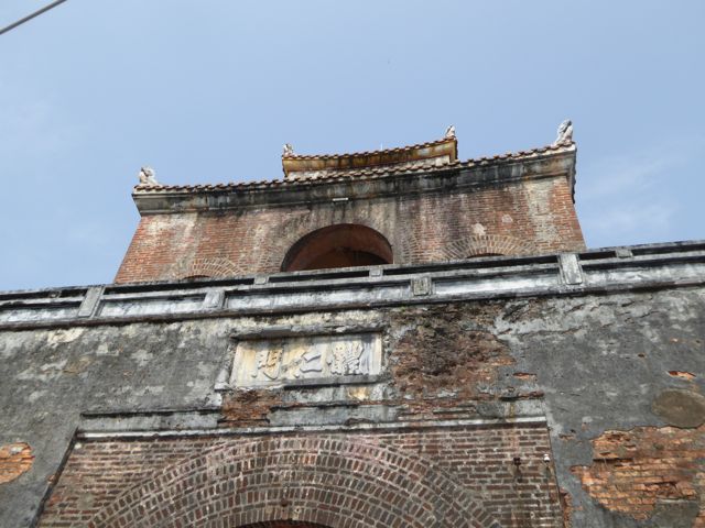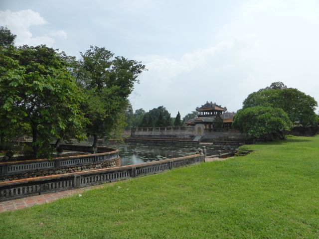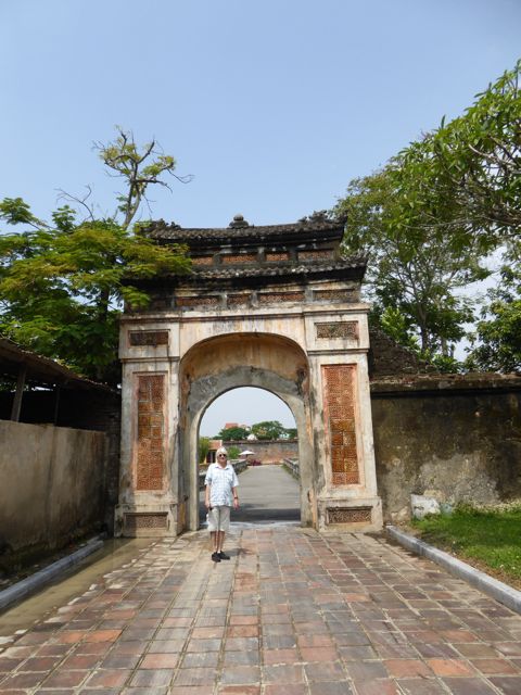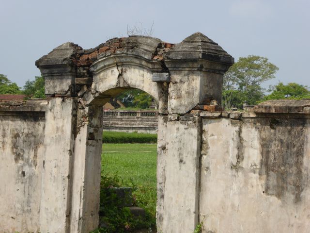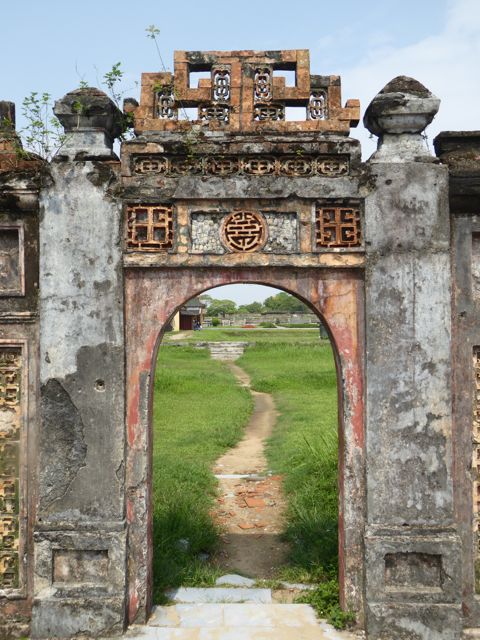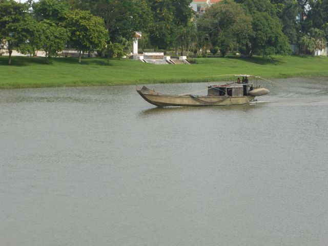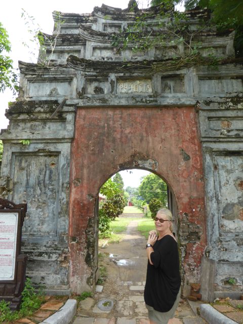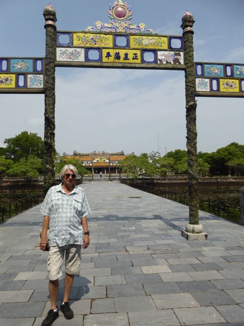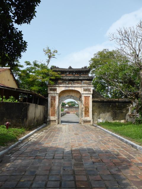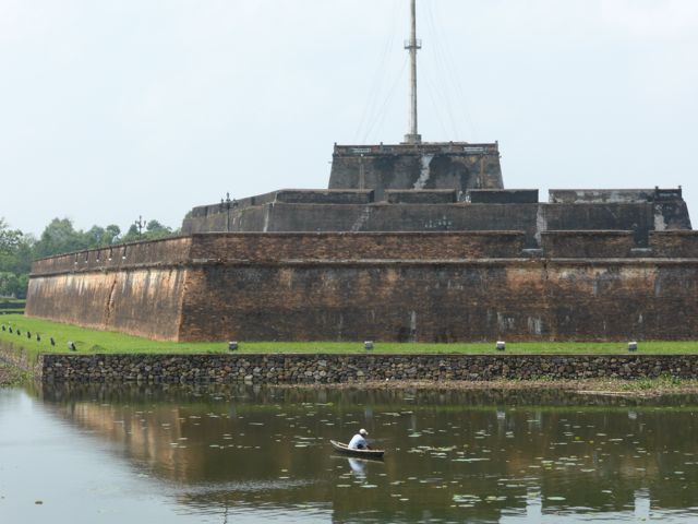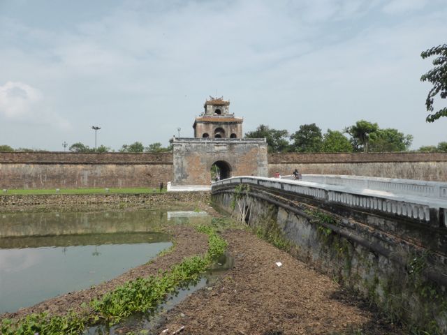 Kaum verlassen wir das Hotel, nachdem wir die Zugtickets nach Da Nang dort klargemacht haben, sind wir auch schon klitschnass. Die Luftfeuchtigkeit flirtet mit 90 Prozent, während wir uns auf den Weg in die Verbotene Stadt von Hue machen. Alle paar Meter fragt man, ob wir vielleicht ein Cyclo, also eine Fahrradrikscha, oder vielleicht einen Transport per Motorrad wünschten – wir winken ab. Offenbar und offensichtlich laufen nicht viele Touristen durch die sengende Sonne oder den 30 Grad heißen Schatten. Wir ja 🙂 Aber auch der Parfumfluss zeigt keinen Windhauch…