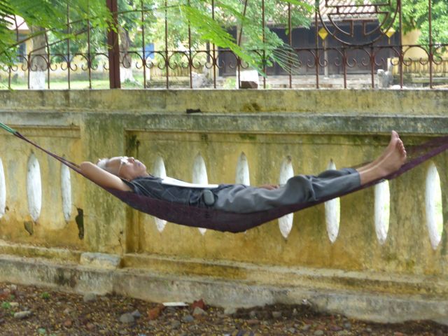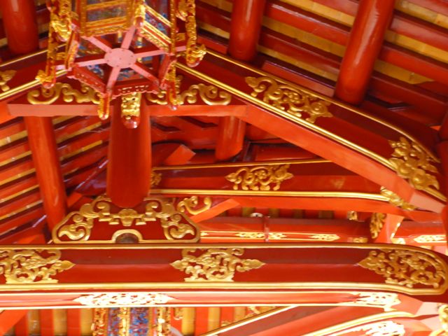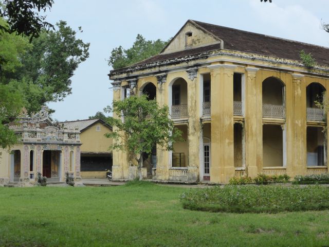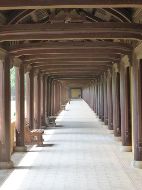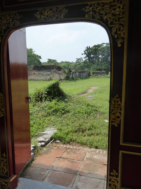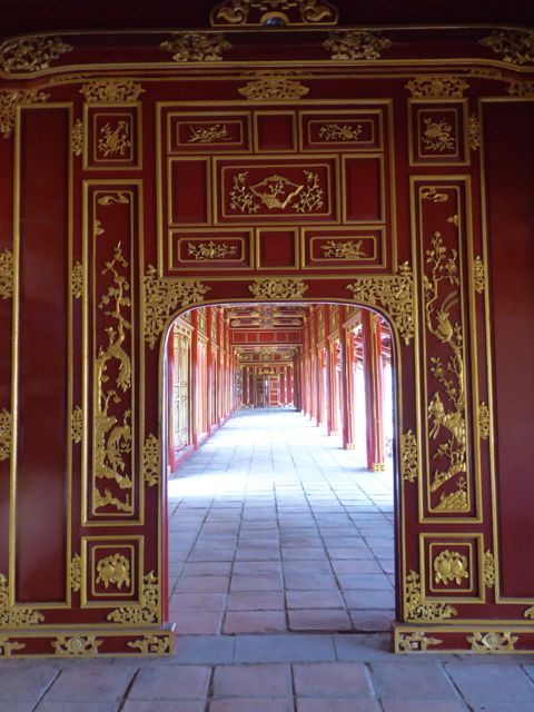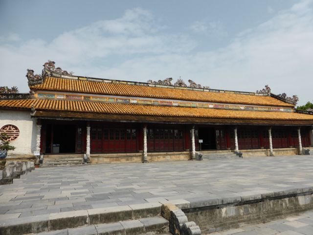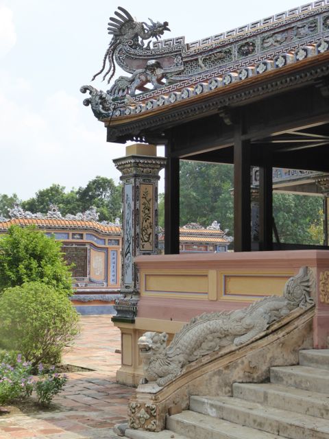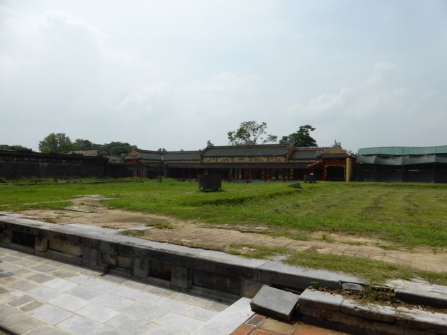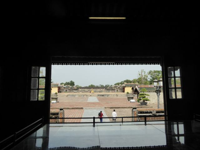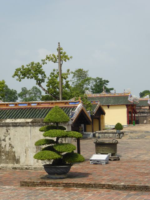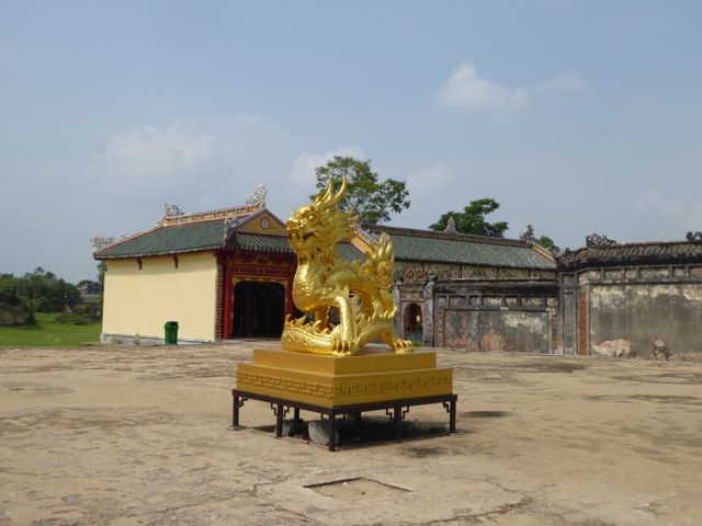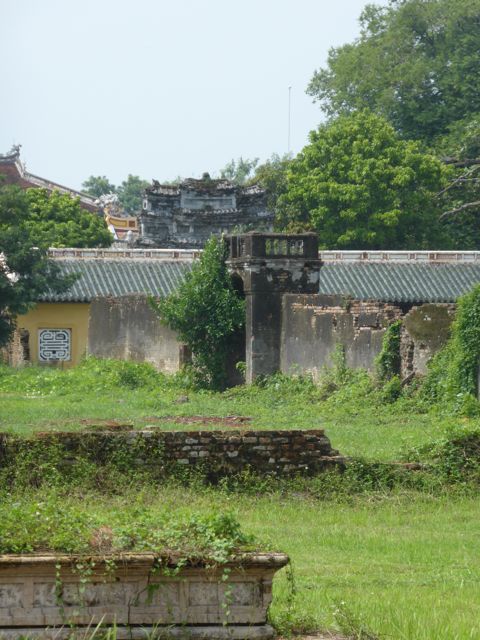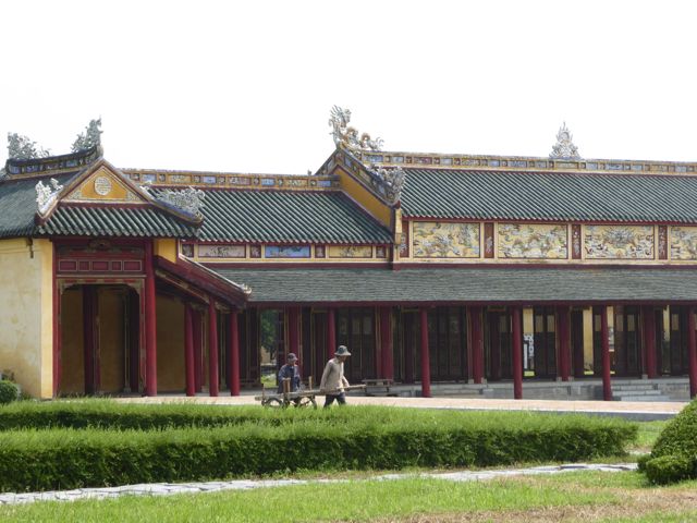 Das erste, das wir von der Verbotenen Stadt sehen, ist eine Baustelle. Es gibt hier noch immer viel zu tun, um die Schäden aus dem Vietnamkrieg zu reparieren. Wollen wir mal hoffen, dass ein Teil des Eintrittspreises von knapp 5 Euro dafür verwendet wird… Bis zum Ende der französischen Kolonialzeit hat die kaiserliche Familie hier residiert, erfahren wir durch ein koreanisches (!) Video. Im Amerikanischen Krieg gab es dann verheerende Zerstörungen. Dieser Bereich des Palastes, die gesamte Verbotene Stadt, wurde im frühen 19. Jahrhundert nach chinesischem Vorbild aufgebaut und dem Pekinger Pendant nachempfunden, aber tatsächlich gibt es keine ersichtlichen Parallelen, sieht man von der konfuzianischen Ausrichtung der Gebäude einmal ab. Da wir sehr früh unterwegs sind, haben wir die Möglichkeit, uns alles genau anzusehen. Mit dem Einfall der Touristenbusse hauen wir schon wieder ab, trinken ein Bier am Fluss, weil wir dringend eine Pause brauchen. Danach schlendern wir Richtung Hotel, bleiben noch in einer Backpacker-Kneipe hängen und trudeln endlich am Pool an. Sehr schwer vorstellbar, dass wir uns von hier aus noch groß fortbewegen werden.