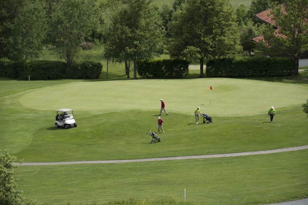 In Ruhpolding stoppen wir kurz, um uns einen Golfplatz anzusehen. Ganz schön, aber ein bisschen provinziell. Ganz anders der Platz in Reit im Winkl – der ist einfach furchtbar. Vor der Kulisse eines gruseligen Hotelkomplexes tobt sich der Platz über Höhen und Tiefen aus wie geisteskrank. Keinen Schlag werden wir hier tun!