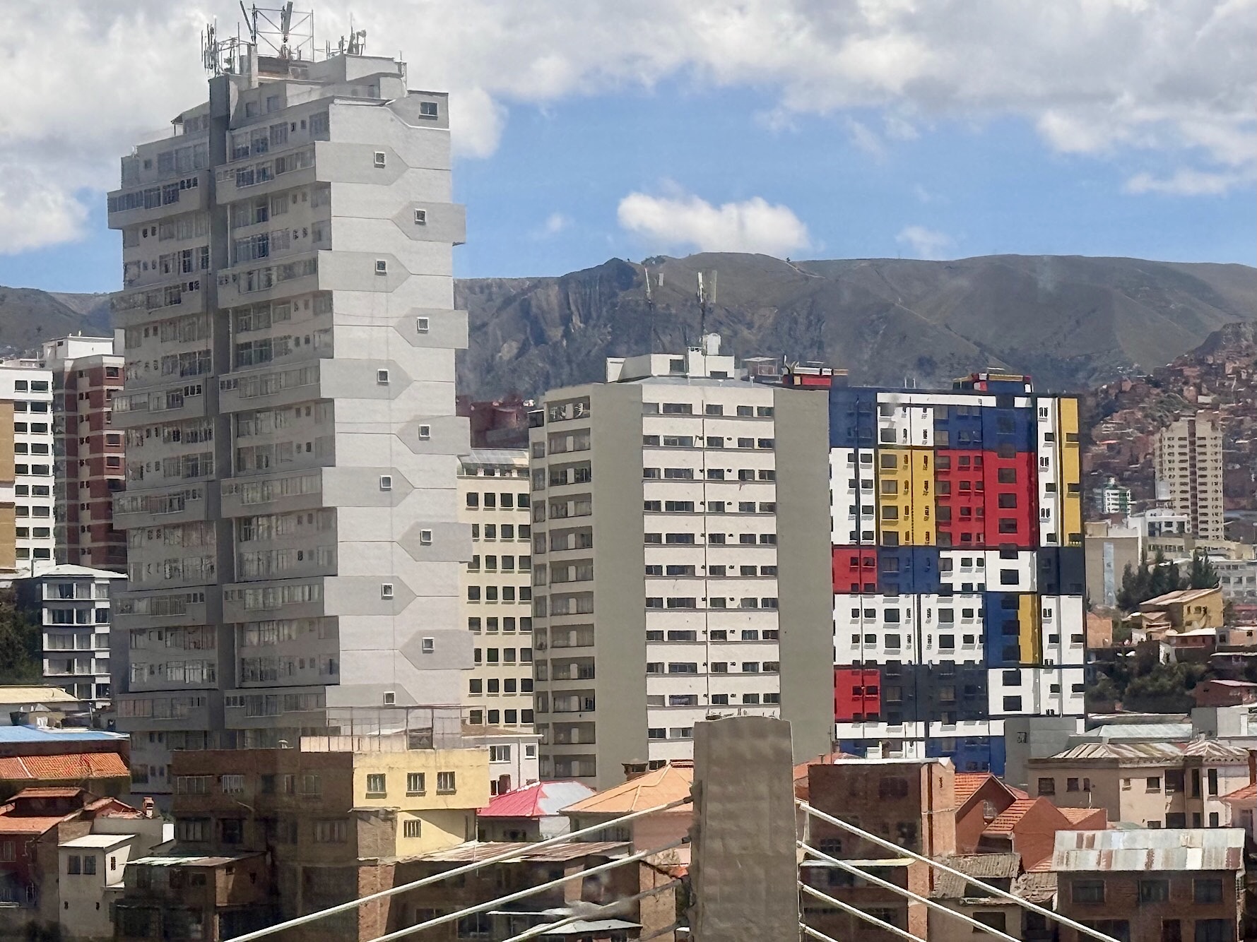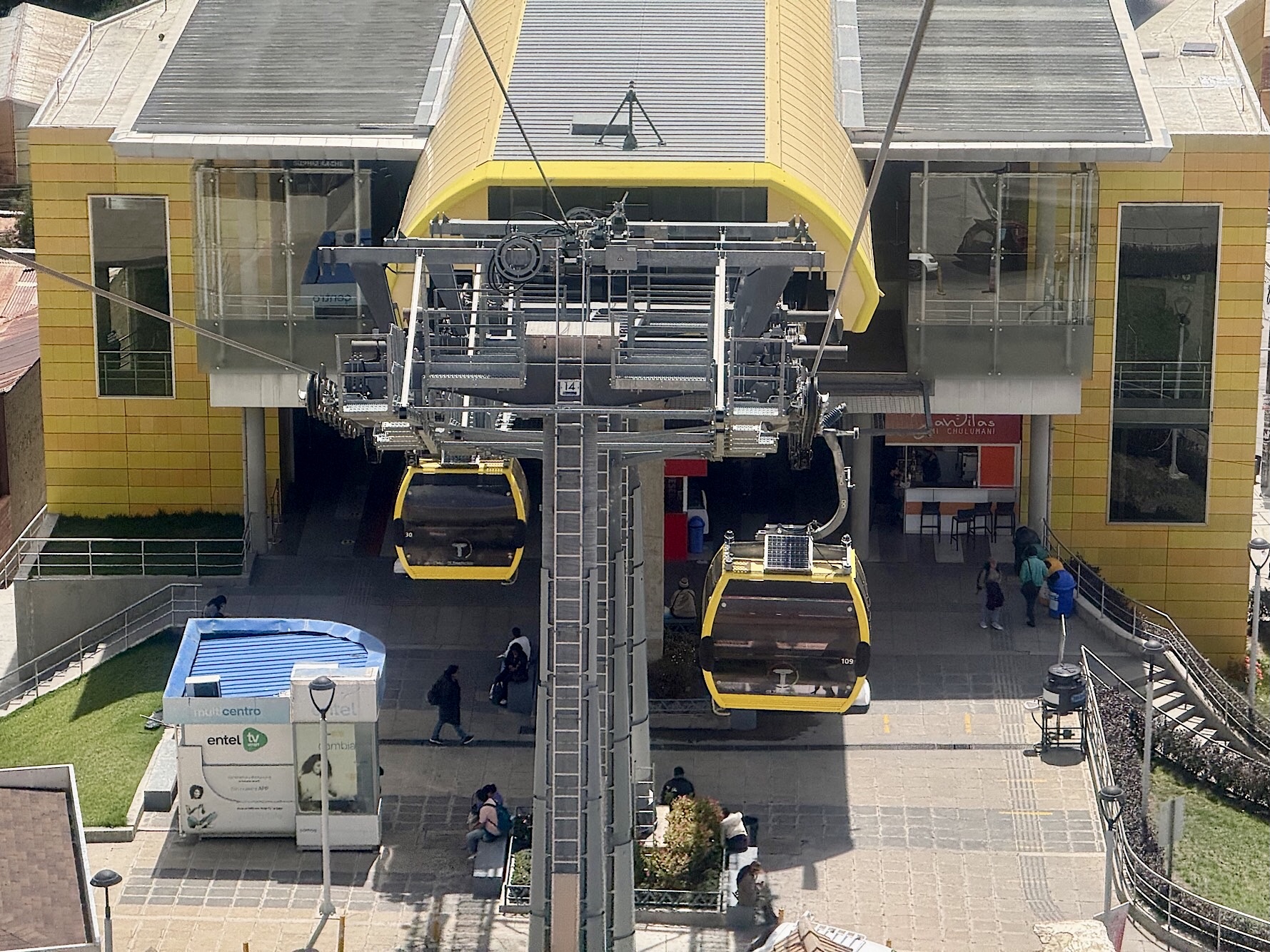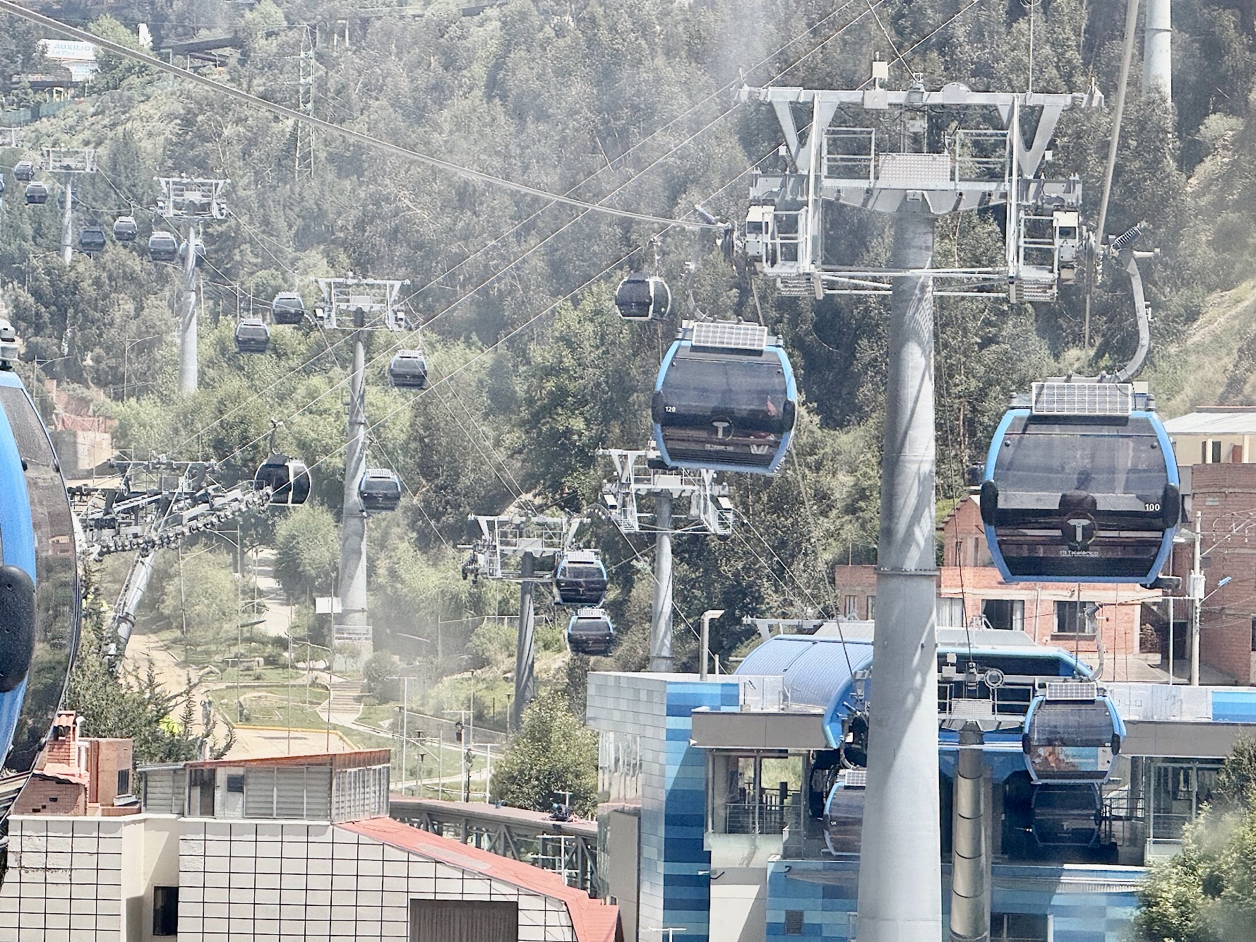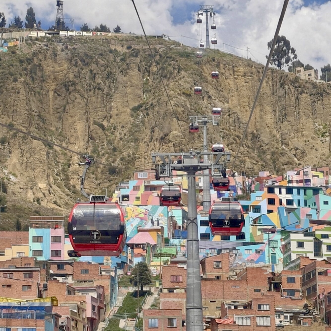 Wir steigen oben auf einem Plateau um in die gelbe Linie. Neben uns sitzt ein gut gekleideter Mann, der uns von den Cholets in El Alto erzählt, farbigen, geometrischen Palästen der neuen Aymara-Elite. Eventhallen, die aussehen wie futuristische Tempel. Familien, die sich mit diesen Gebäuden sichtbar machen, stolz, laut, unübersehbar. „Früher hat man uns Cholos genannt“, sagt er. „Jetzt bauen wir Cholets. Wir haben das Wort zurückgeholt.“ Sein Lachen füllt die Gondel.
