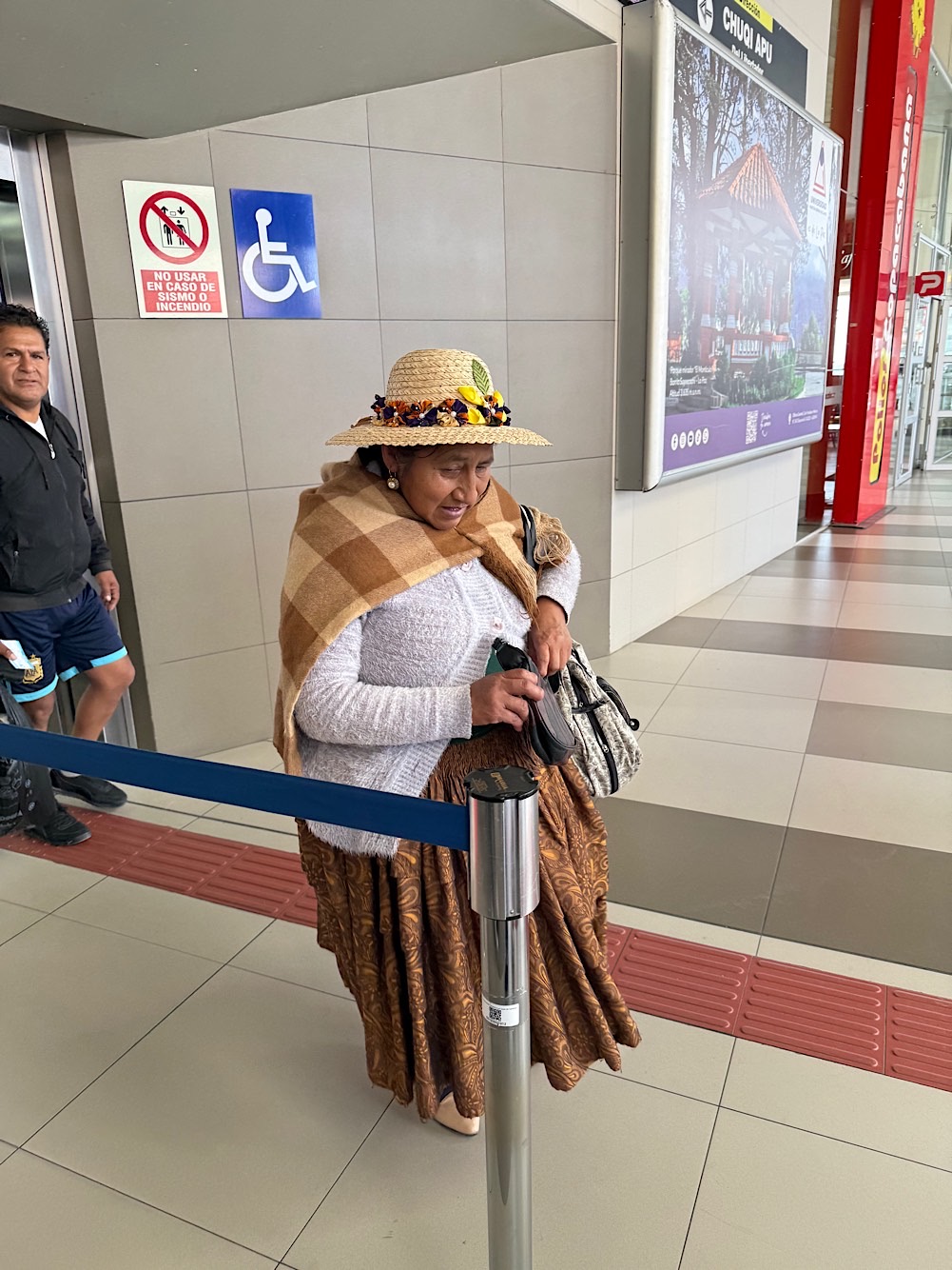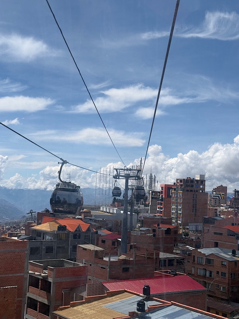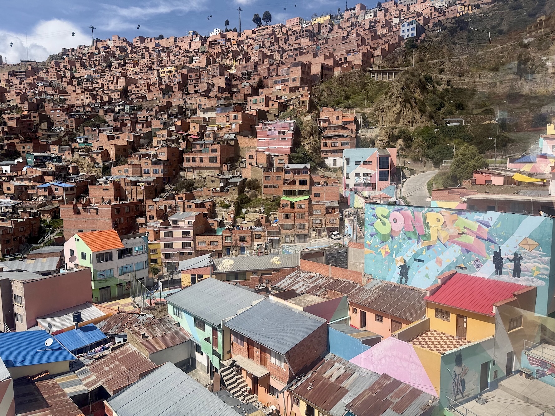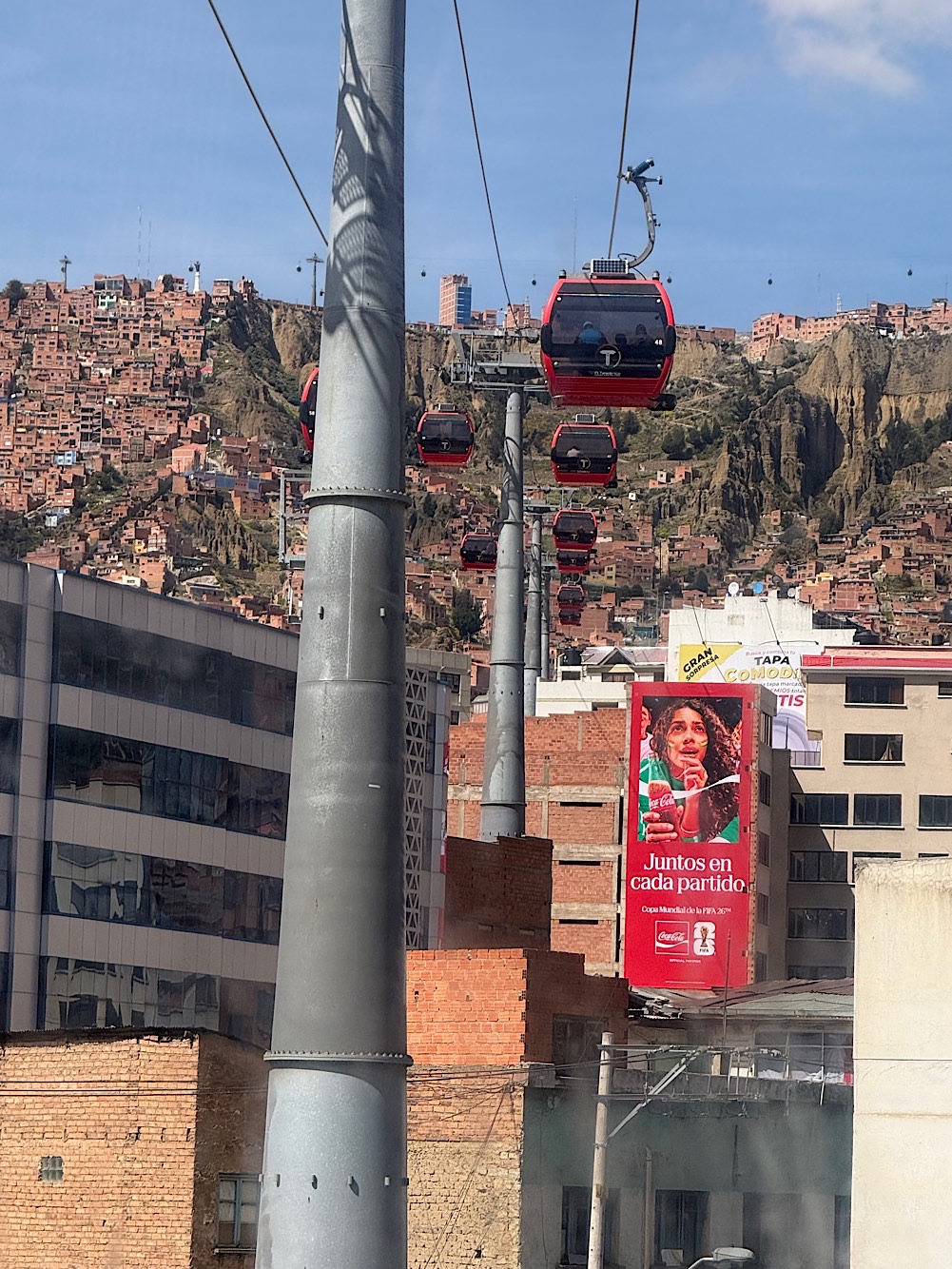 Wir steigen oben auf einem Plateau um in die gelbe Linie. Neben uns sitzt ein gut gekleideter Mann, der uns von den Cholets in El Alto erzählt, farbigen, geometrischen Palästen der neuen Aymara-Elite. Eventhallen, die aussehen wie futuristische Tempel. Familien, die sich mit diesen Gebäuden sichtbar machen, stolz, laut, unübersehbar. „Früher hat man uns Cholos genannt“, sagt er. „Jetzt bauen wir Cholets. Wir haben das Wort zurückgeholt.“ Sein Lachen füllt die Gondel.