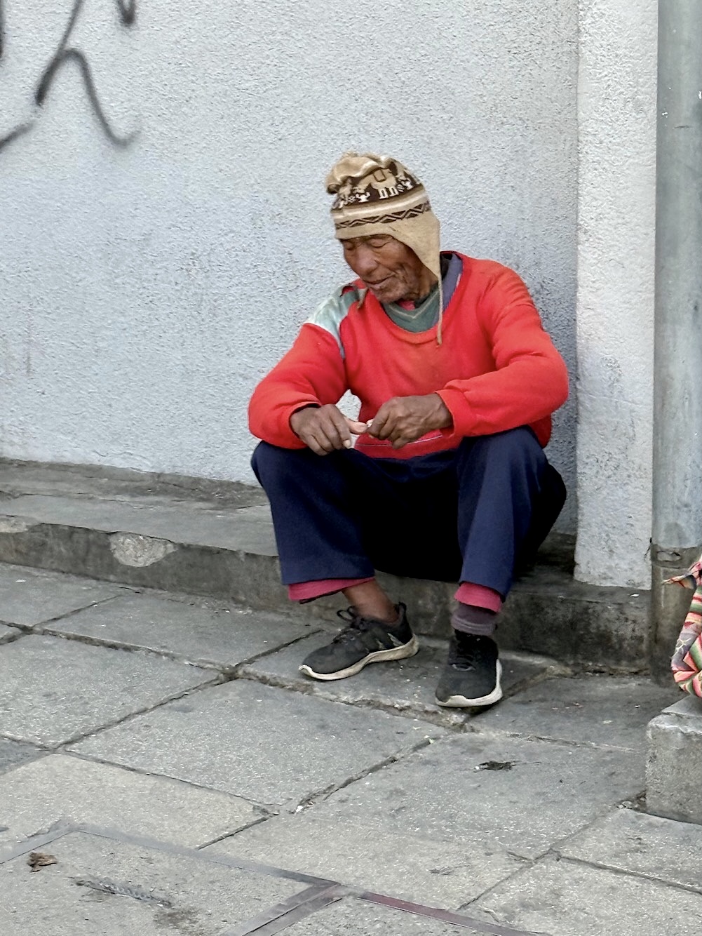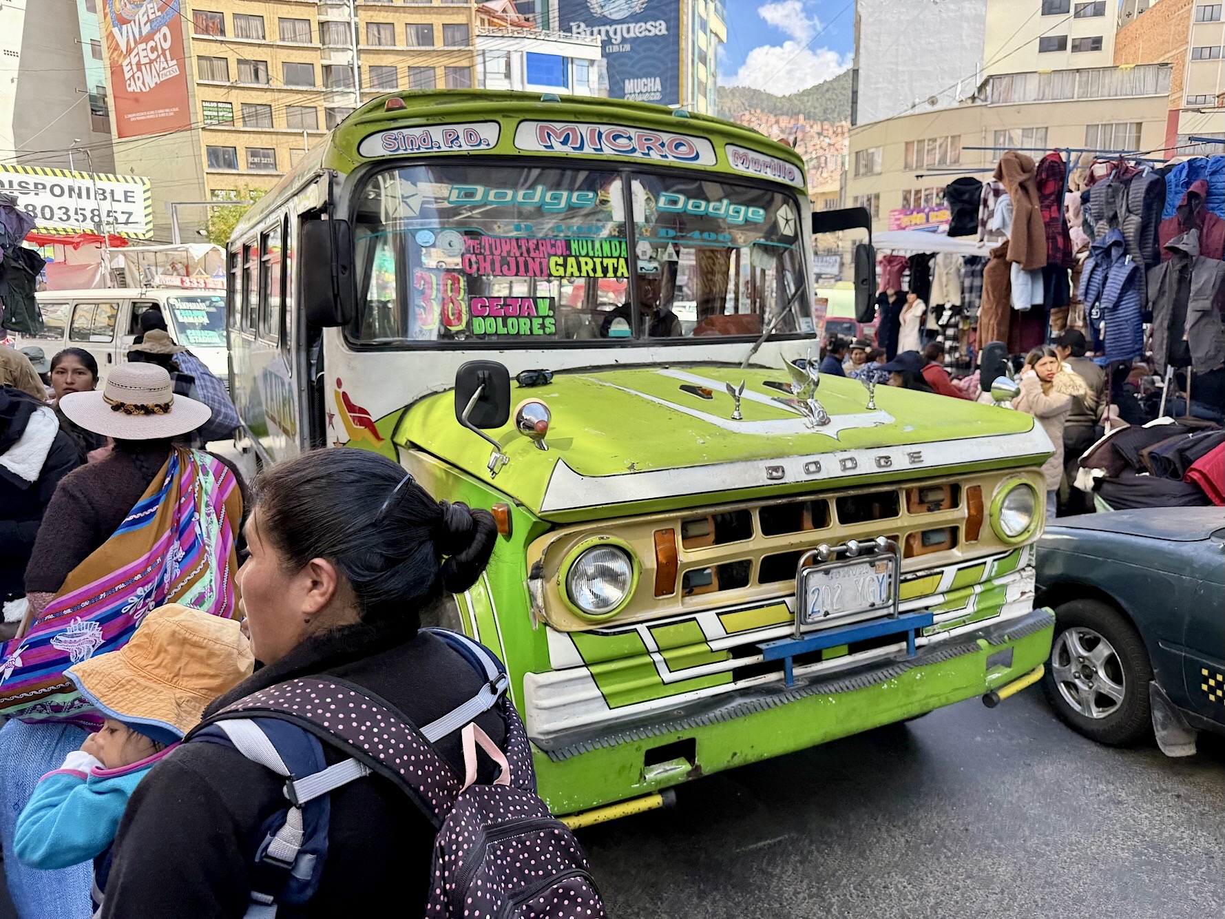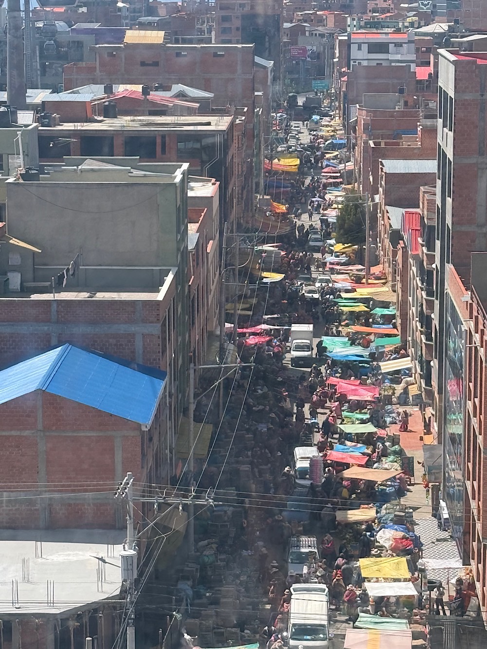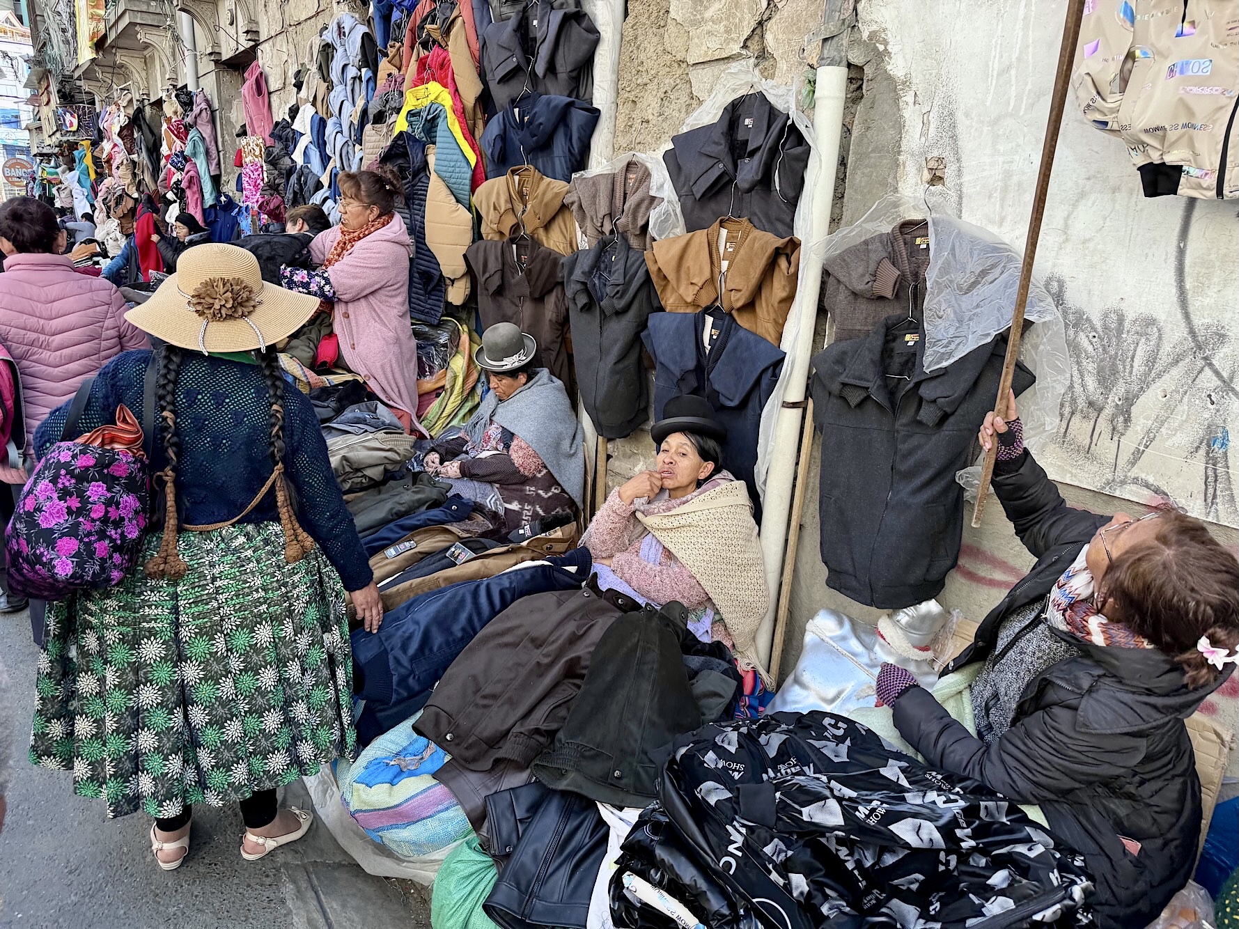 Der Spaziergang durch die umliegenden Straßenst anstrengend, wir versuchen Steigungen zu vermeiden, was in La Paz fast schon ein Witz ist. Die Höhe von rund 4000 Metern macht sich bemerkbar. Es ist Samstag, und überall entstehen Verkaufsstände: Kleidung, Spielzeug, Obst, Schuhe, alles, was man tragen, stapeln oder rollen kann. Touristen sieht man kaum, dafür umso mehr Familien mit und ohne Tracht, Händler, Kinder, Hunde. Der Verkehr nimmt stündlich zu, als würde die Stadt sich selbst verdichten.
