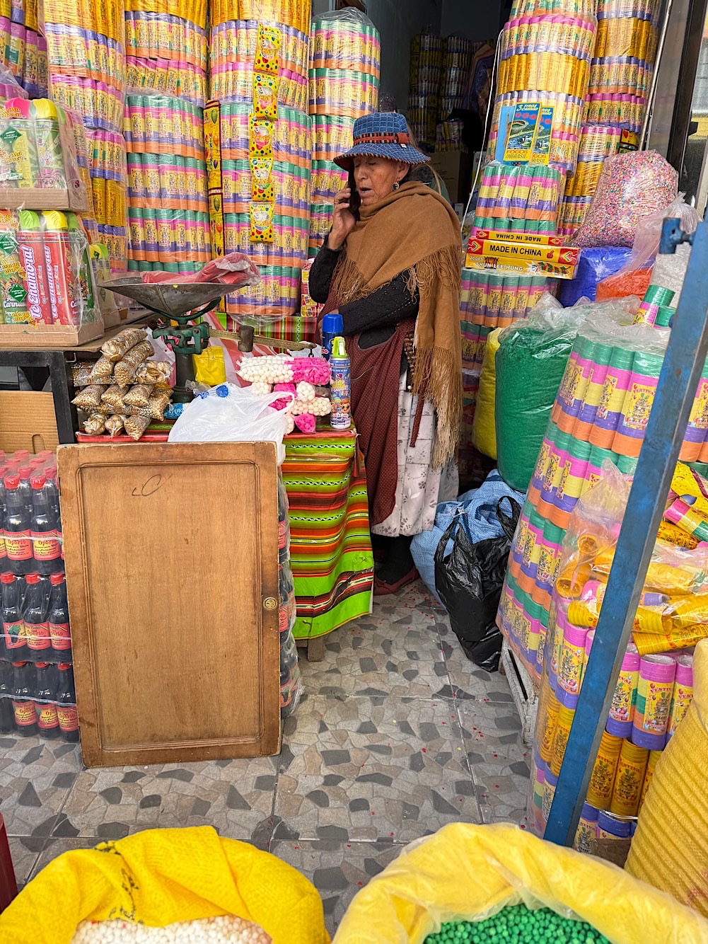Mit der celeste Linie gleiten wir zurück Richtung Zentrum, steigen an El Prado aus und tauchen zu Fuß in die Stadt ein. Die Gassen werden enger, lauter, bunter. Zwischen Marktständen drängen sich Menschen, die alles verkaufen, was man tragen kann: Socken, Mangos, Schrauben, Schulhefte, Zahnbürsten, Hühnerfüße, Handyhüllen. Das Leben ist hart hier, jedes Geschäft zählt. Jeder versucht, sich irgendwie durchzuschlagen. La Paz ist ein einziger Marktplatz, der sich über Hügel und Täler ergießt. Jede freie Fläche wird genutzt, jede Stufe, jede Ecke.