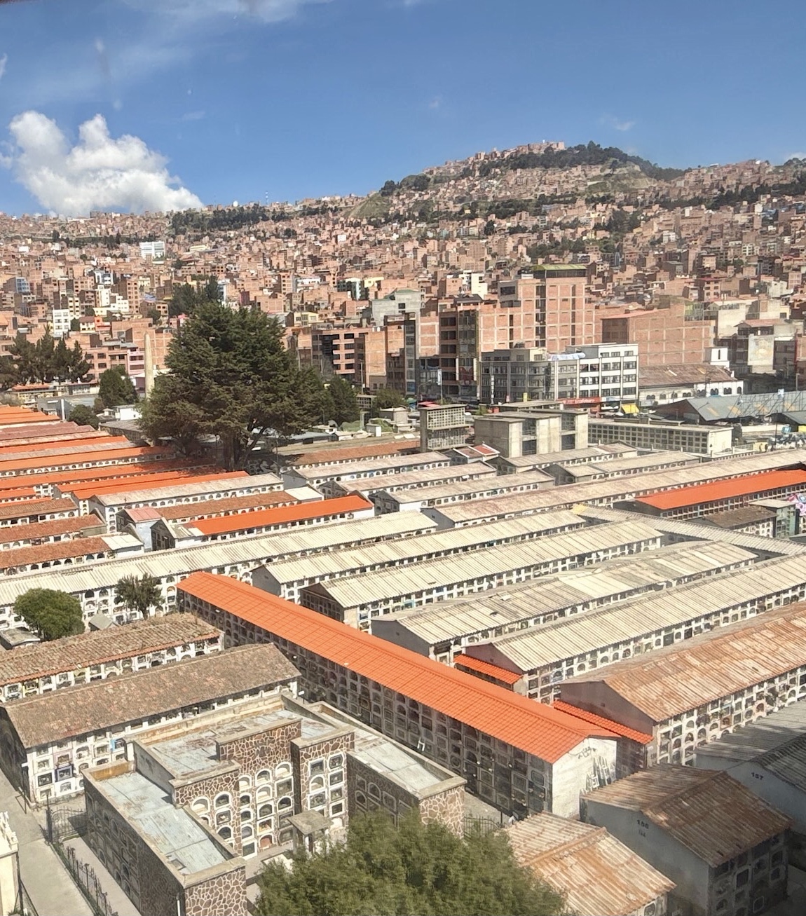 Die rote Linie trägt uns über Dächer, Straßen und ein Gewirr aus Backstein und Blech. Dann öffnet sich unter uns ein Anblick, der gleichzeitig erschüttert und fasziniert: der Cementerio General. Von oben wirkt er wie eine zweite Stadt, streng geordnet, dicht gebaut, monumental. Der Tod ist hier kein abgeschlossener Raum, sondern Teil des Alltags, Teil des Marktes, Teil der Stadt.