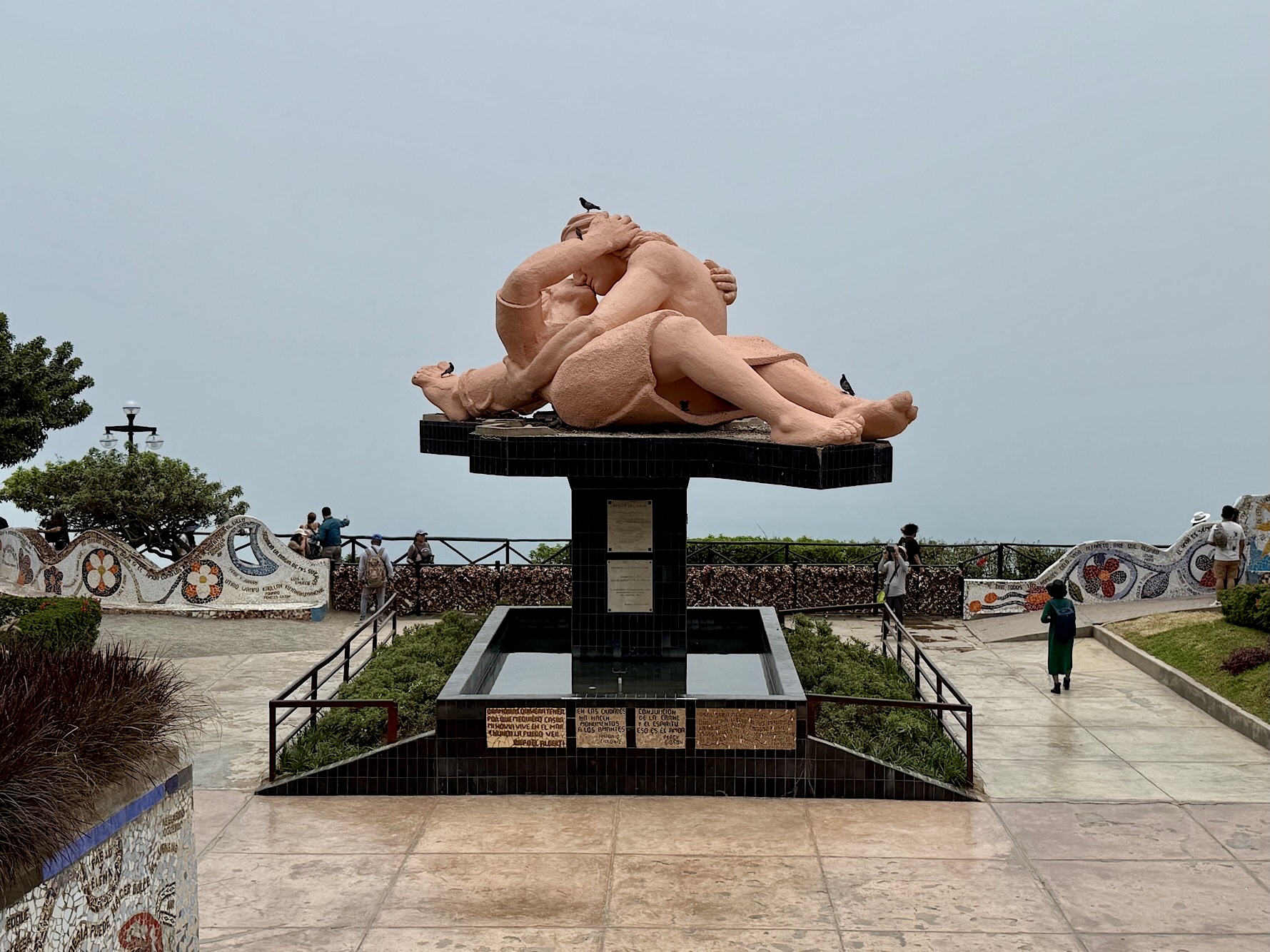 Wir laufen weiter über die Uferpromenade bis zum Parque del Amor. Rund um die berühmte Kuss‑Skulptur wird jede erdenkliche Sprache gesprochen. Wir ruhen kurz aus, aber eigentlich ist es zu schwül, um wirklich zur Ruhe zu kommen. Außerdem haben wir ja einen Plan: Huaca Pucllana.