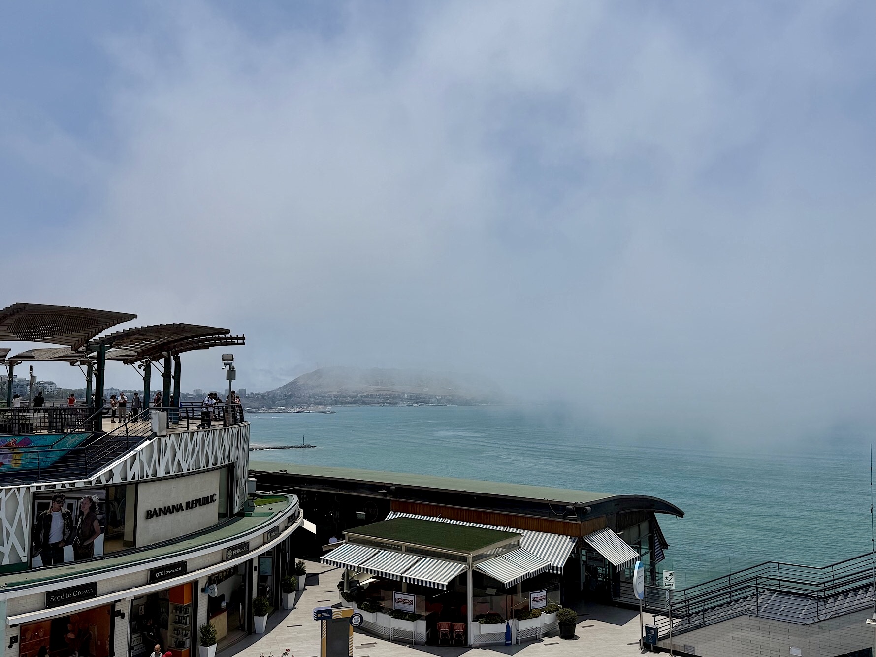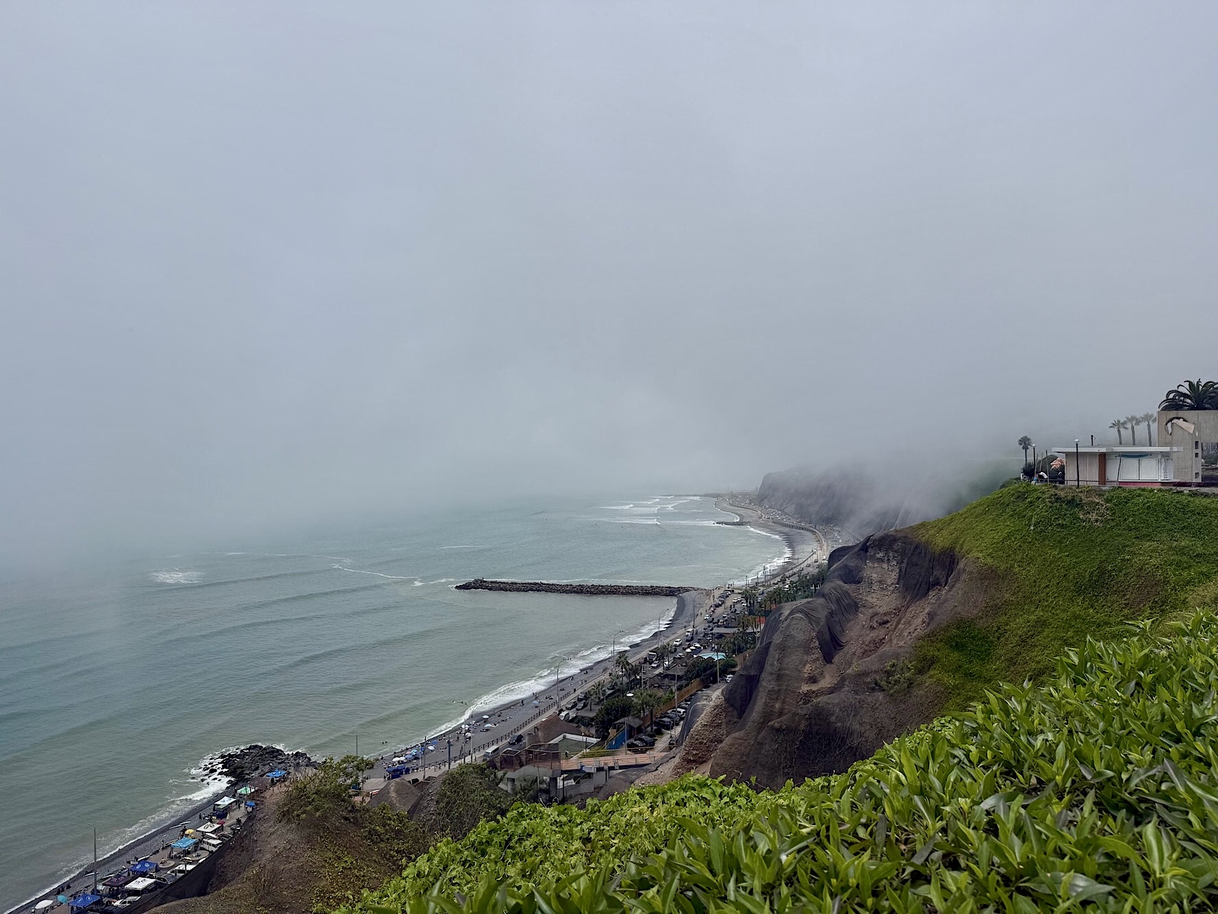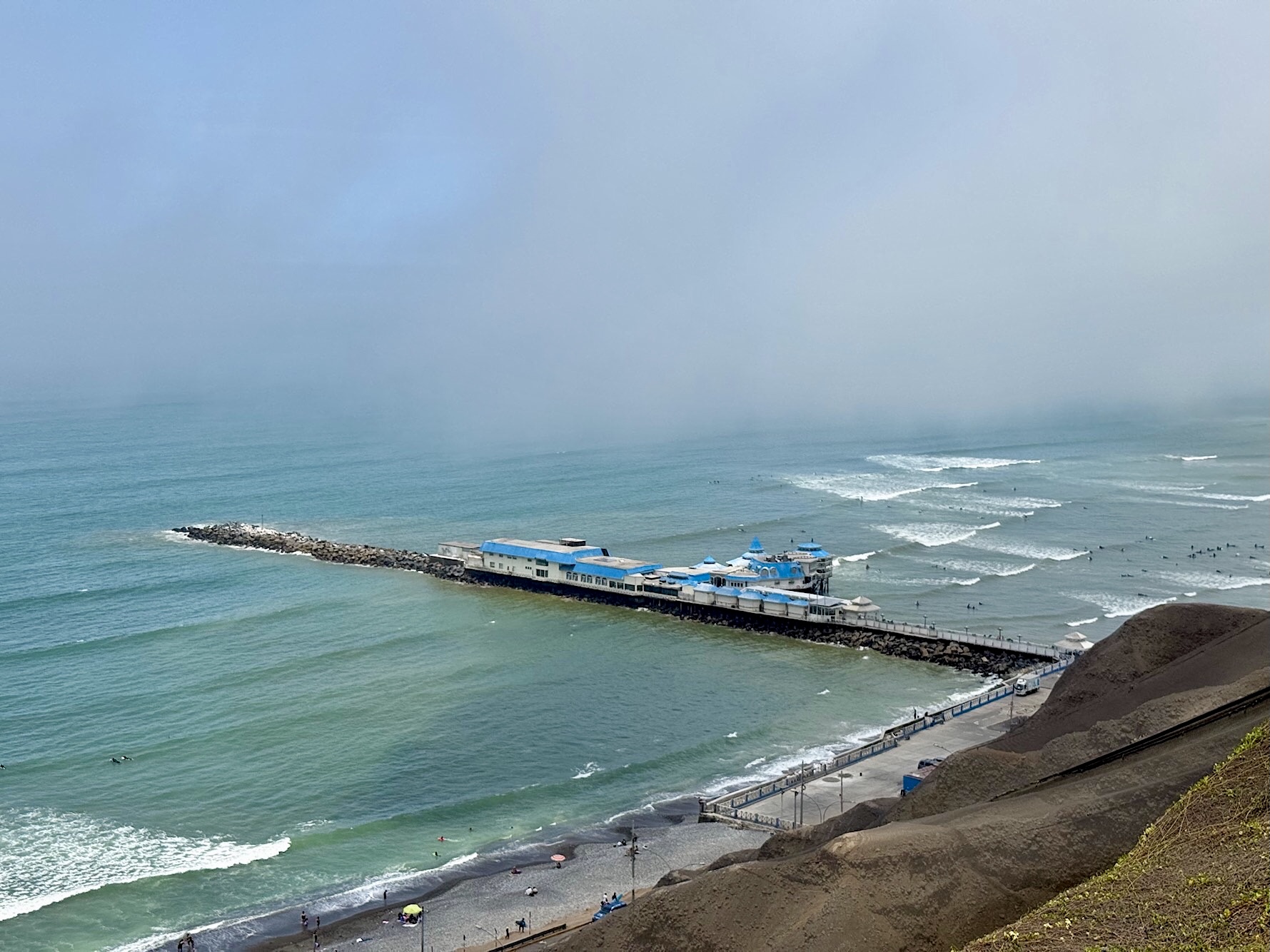Der Ozean zeigt sich heute wieder ganz anders: dicke Nebelschwaden lassen den Horizont verschwinden, ziehen sogar über die oberen Stockwerke der Apartmenthäuser direkt über der Steilküste. Unter uns schiebt sich das Band der Küstenautobahn an den Felsen entlang, im Wasser warten Surfer geduldig auf die nächste brauchbare Welle. Auch von hier oben sieht man gut, dass die Strandqualität von Lima eher… funktional ist.