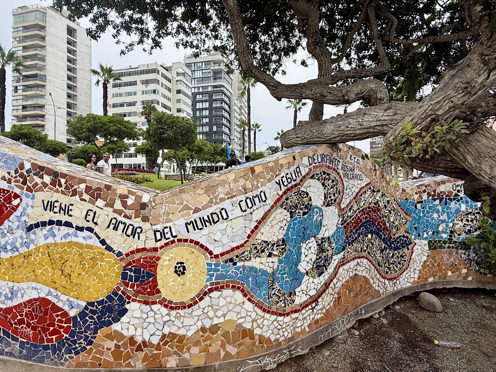 Heute also Miraflores. Wir beginnen den Tag mit einer Uber‑Fahrt zum Kennedy‑Park, einem jener Orte, an denen sich die Stadt in Miniatur zeigt. Nicht nur die Architektur rund um den Platz gefällt uns, sondern auch die Vielzahl der Katzen, die hier leben. Zwischen Blumenbeeten stehen kleine Häuschen, an einem winzigen Kiosk wird Futter verkauft, und die Tiere bewegen sich mit der selbstverständlichen Eleganz von Wesen, die wissen, dass sie hier geduldet, fast verehrt werden.