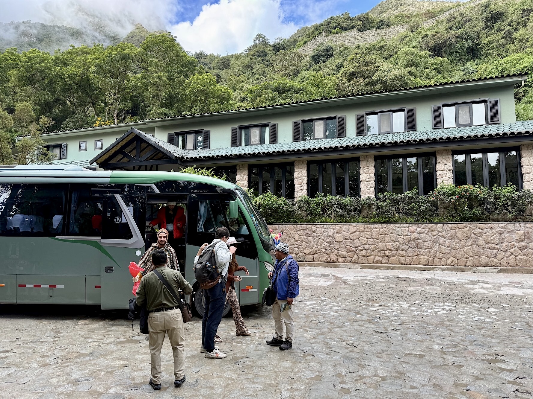 Ziemlich lange Schlangen am Treffpunkt, wir gehen einfach vorbei uns sitzen auch schon im Bus. Der setzt sich gegen neun Uhr in Bewegung. Sobald er voll ist, fährt er los, als gäbe es kein Zurück. Über Schotterstraßen und Serpentinen, hinein in ein dschungelähnliches Gebiet. Gewaltige Pflanzen, tropfende Blätter, Nebel hoch in den Bergen, tief hängende Wolken.. Immer wieder öffnet sich der Blick auf das großartige Andenpanorama. Wir können uns gar nicht losreissen. Das Wort majestätisch fällt mir zu dem, was wir hier sehen, ein.