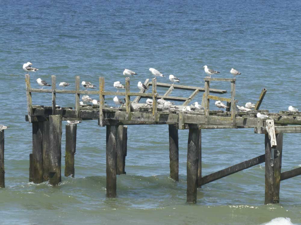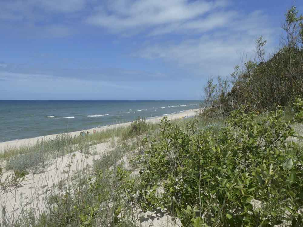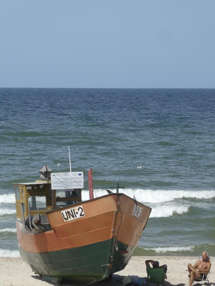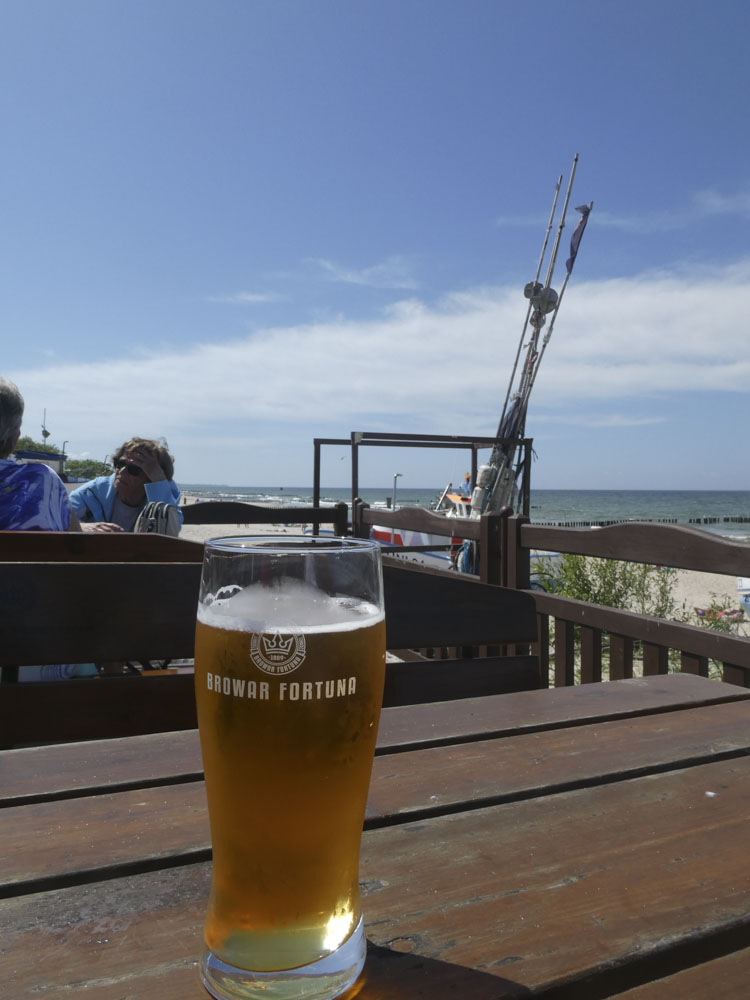 Irgendwann wechseln wir die Seite und gehen ans Meer. Etwas mehr Wind, viel mehr Menschen, aber immer noch überschaubar. Die polnischen Sommerferien beginnen nach den Wahlen am kommenden Wochenende. Wir stapfen mit den Füssen im Wasser kilometerweit Richtung Hotel. Es kribbelt schon ein bisschen auf der Haut. Sonnenbrand-Verdacht…