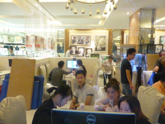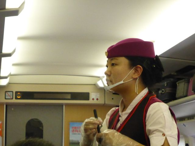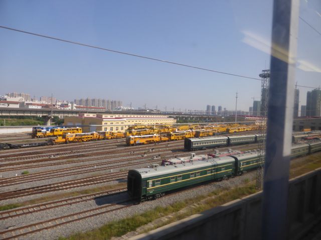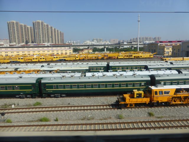 Aber natürlich kommen wir an. Zugfahren in China – das ist schon etwas Besonderes. Die Bahnhöfe, so natürlich auch dieser, sind unvorstellbar groß, aber sehr gut organisiert, wenn man erst einmal sein Ticket hat. Es gibt unendlich viele Züge, aber es müssen ja auch unendlich viele Menschen befördert werden. Wer an DB-Preise gewöhnt ist, kann nicht glauben, wie günstig Zugfahren sein kann. Wir haben alle Zugtickets über eine Agentur gebucht. Das kostet zwar ein paar Euro Servicegebühren, dafür erspart man sich aber lange Warteschlange vor den Ticketschaltern. Hat man seine Karte, wird das Gepäck durch einen Durchleuchter geschoben: Sicherheitskontrolle. Anschließend begibt man sich in einen für seinen Zug vorgegebenen Wartebereich. Und wartet. Rechtzeitig öffnen sich die Pforten, dann schieben Hunderte in Richtung Gleis. Auch hier ist alles wieder super organisiert: Auf dem Bahnsteig stehen die Nummern der Waggons, da – und nur da – wartet man, bis der Zug kommt. Durch dieses System wird der Einsteigeprozess schon mal entspannt. Ist man im Zug, begibt man sich zu seinem Platz, lädt sein Gepäck ab. Kaum fährt der Zug ab, kommt schon die erste Putzfrau und feudelt mal kurz den Boden. Wischt sie nicht feucht, kommt jemand mit Besen und Aufnehmer oder Müllbeutel – hier wird ständig saubergemacht ! Manchmal schlängelt sich das Putzpersonal an den Stewardessen des Zuges vorbei. Im Angebot sind warme Speisen, Obst, Kekse und Süßigkeiten, Kaffee, Tee, kalte Getränke … Und es wird viel gekauft und konsumiert, gleichgültig, wie kurz die Reise ist. In früheren Zeiten muss es in den Zügen während der Fahrt hoch hergegangen sein. Aber mit der Einführung der Smartphones ist der Lärm absolut in Ordnung und zu ertragen. Manchmal ist es so still, dass man den Gesang irgendeines Mädchens im ganzen Waggon hört…