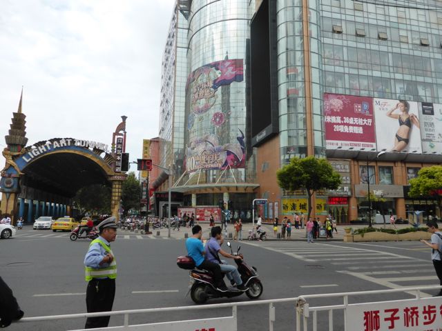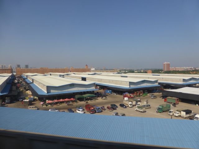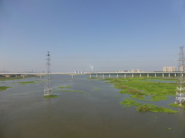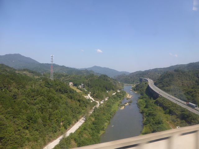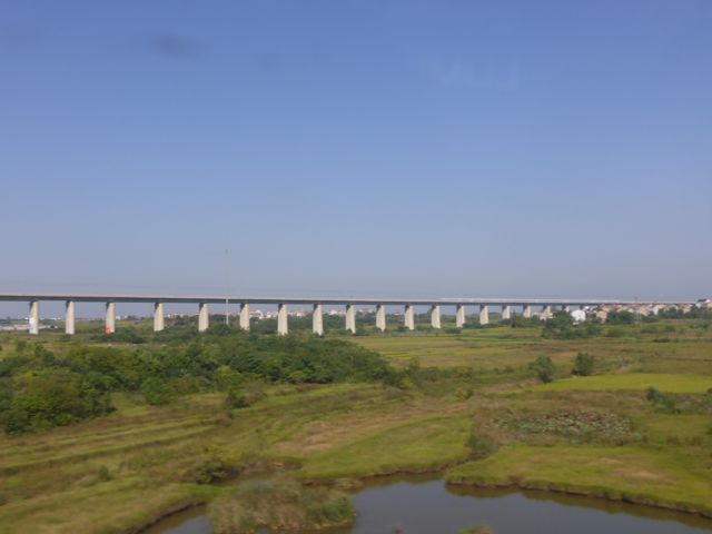 Uns interessiert allerdings viel mehr, was sich draußen im vorbeiziehenden China tut. Wir haben natürlich absichtlich nur Züge gebucht, die tagsüber fahren. Eine ebenso plietsche Entscheidung wie die, Trolleys statt Rucksäcke mitzunehmen. Die unter dem Gewicht ächzenden Backpacker, die natürlich auch alle dazu noch viel mehr Kram mit sich herumschleppen, schielen schon mal in unsere Richtung, wenn wir unsere Wägelchen mit leichter Hand vier uns herschieben… Zurück in den Zug: sanfte Hügel enorme Agrarflächen, überwiegend Reisanbau, aber auch Mais, Weintrauben, Gemüse. Menschen, die mutterseelenallein, so scheint es, große Flächen bearbeiten, an denen wir mit der Höchstgeschwindigkeit von 207 km/h vorbeizischen. Und dann die Städte. Man muss sich disziplinieren und weiteratmen, auch wenn es manchmal schwerfällt. Wir rauschen durch Riesenansiedlungen, deren Namen wir weder sehen, noch könnten wir sie irgendwo zuordnen. Es ist alles groß, es ist von allem viel, es ist anstrengend.