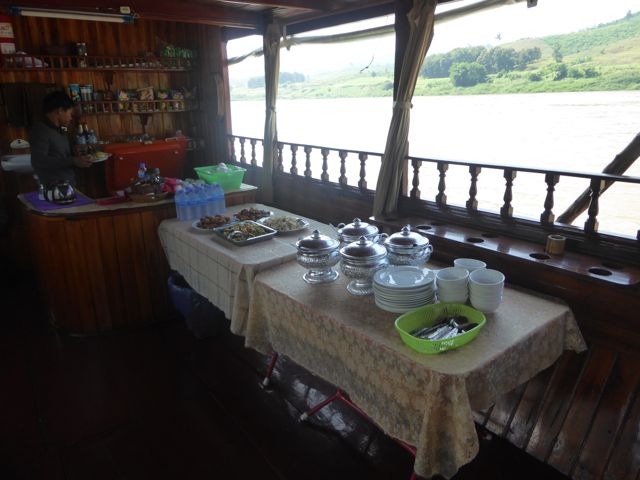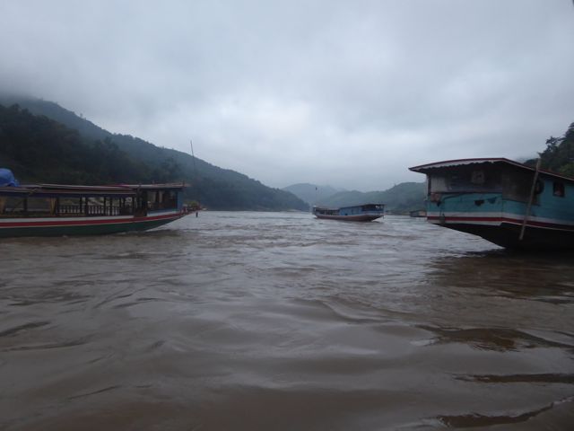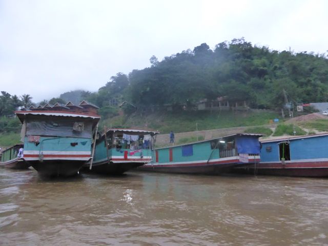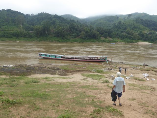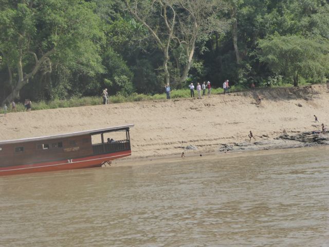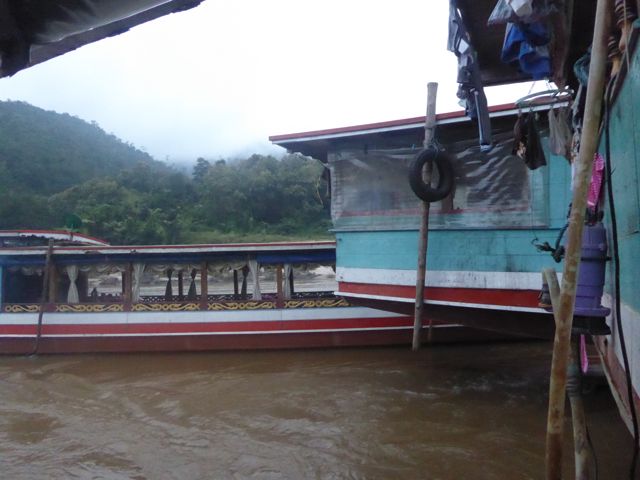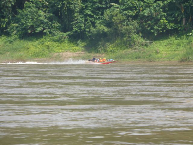 Más tarde, algunas horas, llegamos hasta la desembocadura del Nam Tha River en el Mekong, en ese lugar hicimos una parada de control que todos los barcos tienen que hacerla, porque unos 10 kilómetros más adelante el Mekong tiene una orilla de Laos y la otra de Thailandia, también nos contaron que a ambos lados hay controles militares. Está es una zona de mucho contrabando de droga y pensamos que puede ser por eso.