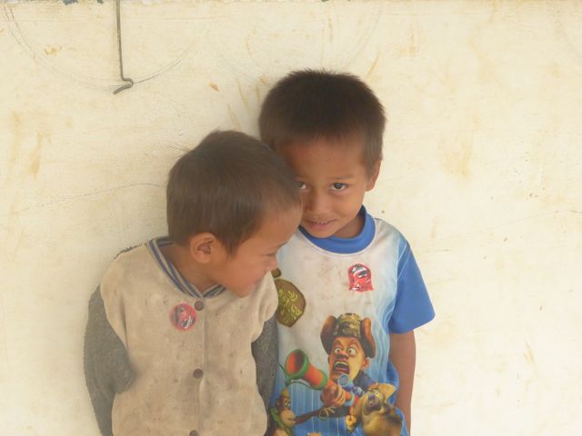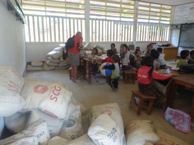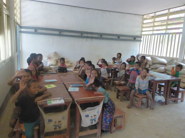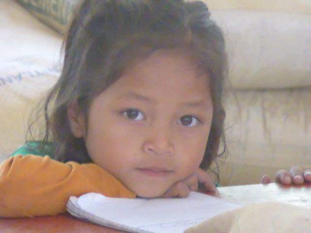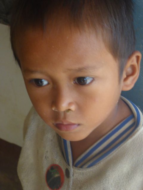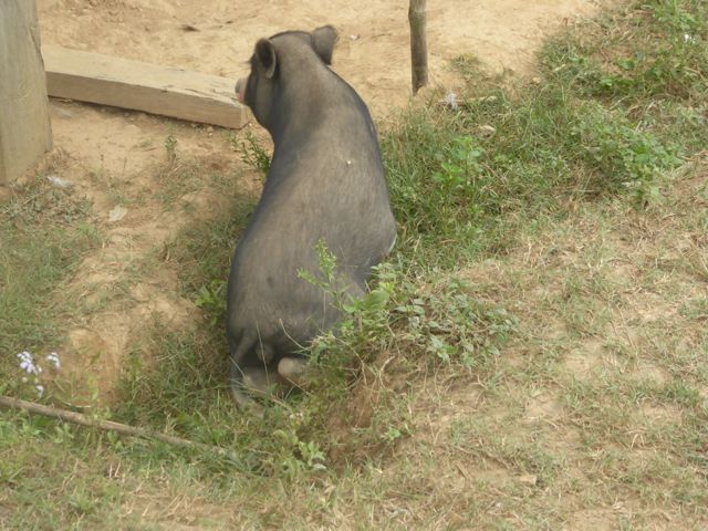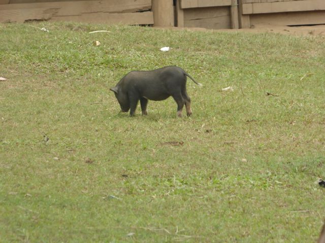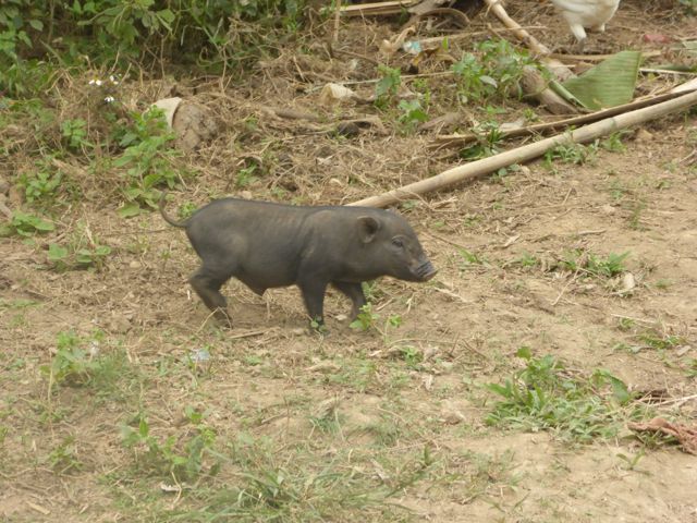 En la mitad del trayecto, hicimos una parada en un pueblo, estaba planeado por el guía del barco. Nosotros pensamos que sería como siempre es para los turistas, para venderles algo, pero no, fue muy interesante. Nos mostró un auténtico pueblo de la gente que vive sobre el río, como construyen sus precarias casas y como viven. Nos contó por ejemplo que las mujeres hacen todos los trabajos en la casa o el pueblo y cuidan los hijos y el hombre tiene sólo que salir a buscar comida, pescando o como sea. Las casas no tienen ventanas y hay pequeños corrales con chanchos o gallinas. Subiendo una cuesta nos mostró también la escuela que estaba en ese momento funcionando, tres aulas con chicos de 7 u 8 años.