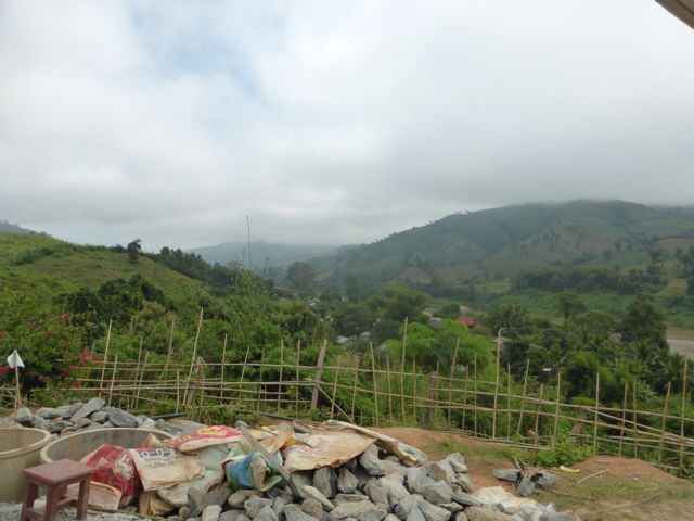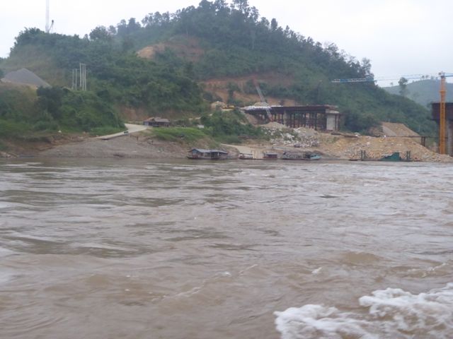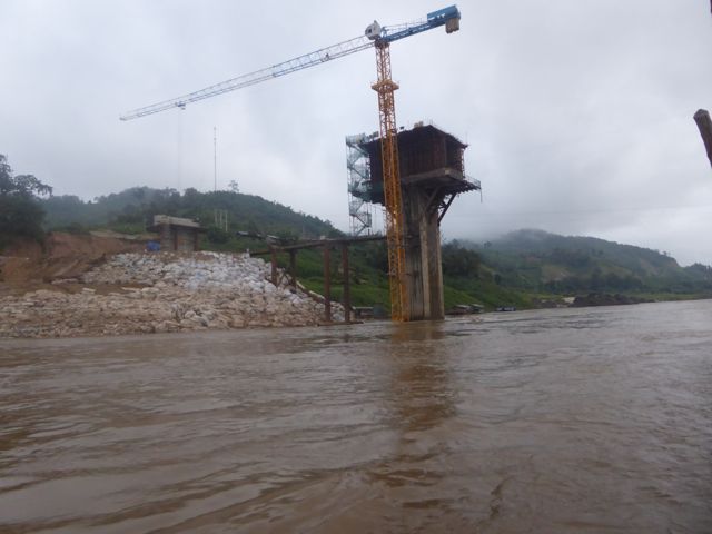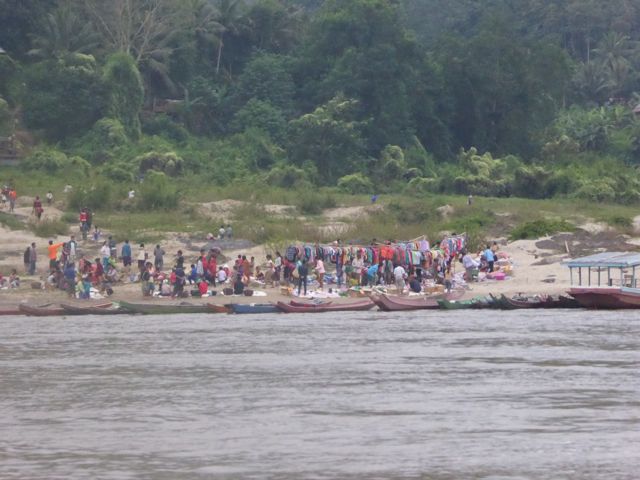 Vier unserer Mitreisenden fahren heute wieder zurück nach Luang Prabang, wir anderen machen uns auf den Weg nach Huay Xia, Richtung laotisch-thailändische Grenze. Fünf nach halb sieben legt unser Boot in einem gewagten Manöver aus der breiten Front der Schiffe wieder ab – wir befinden uns auf dem Strom. Es gibt Kaffee oder Tee, alle essen Mitgebrachtes aus den jeweiligen Herbergen. Der Tag beginnt mit tiefhängenden Wolken und einigen Nebelbänken. Die Crew hat vorsichtshalber ein paar Decken hingelegt, es ist kühl. Comme si – Comme ça: „Seit zwei Tagen haben wir Winter, das spürt man, es wird kalt.“ Kann man so sagen. Dennoch verliert der Regenwald keineswegs etwas von seiner Faszination. Nach der Pause in Pakbeng merkt man allerdings zunächst, dass man sich wieder einer eher zivilisierten Gegend nähert. Größere Dörfer, vor allem ein Brückenbau. In zwei Jahren soll die Brücke über den Mekong fertig sein. Ein chinesisch-thailändisches Projekt, das auch in Laos zu grossen Veränderungen führen wird. Im Moment aber wird erst einmal gebaut. Etwas später fahren wir an einer Menschenansammlung direkt am Fluss vorbei. Unser Guide erklärt diesen Markt, der ein-, zweimal im Monat stattfindet: es ist ein reiner Tauschmarkt für die Landbevölkerung. Tshirt gegen Reis, Fisch gegen Fleisch und so weiter.