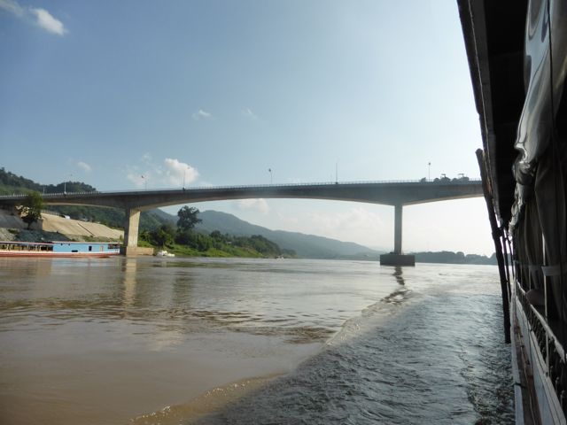 Antes de llegar a Huay Xai en Laos, cuando faltan unos 14 kilómetros, pasamos por debajo del puente que cruzaremos para pasar a Thailandia. Huay Xai es una ciudad más importante y el muelle donde atracamos muy precario, el mini bus que nos llevara hasta el puente nos estaba esperando. Además de nosotros van a Thailandia una pareja de ingleses y dos alemanes, Werner se queda en esa ciudad hasta el día siguiente, para mi alegría 🙂 El guía también va con nosotros hasta la frontera. El proceso para pasar a Thailandia es muy original, del lado de Laos presentamos nuestros pasaportes y pagamos un dólar, luego nos sellan el pasaporte y compramos un ticket para el bus que nos llevara hasta el lado de Thailandia, cuesta también un dólar. Luego esperamos 40 minutos y viajamos con el bus 3 kilómetros a través del puente sobre el Mekong hasta donde está la oficina de migraciones de Thailandia, nos sellan los pasaportes y ya está, entramos al país Thai.