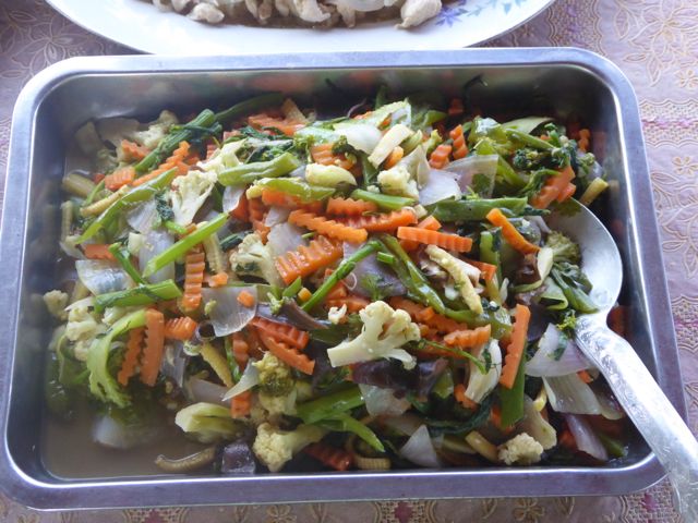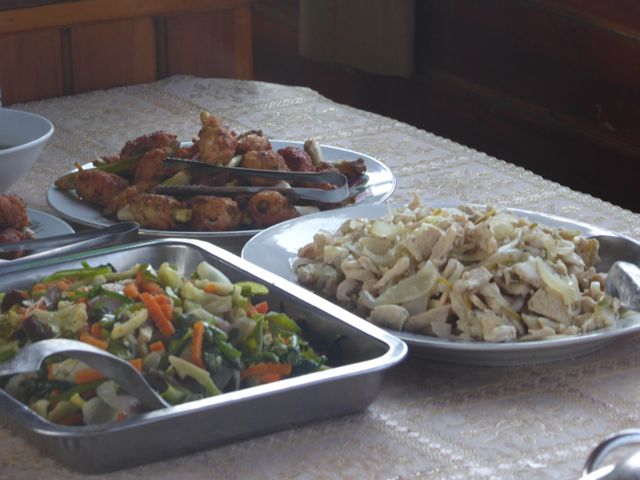 Zum Lunch gibt es heute eine Gemüsesuppe mit Tofu, gekochten, grosskornigen weißen Reis (den suche ich mal für zuhause), gemischtes, mit Kräutern geschmortes Gemüse, Schweinefleisch mit Ingwer (dünne Scheibchen Schwein, Ingwer offenbar gepresst, Zwiebeln und hell geschmort), Huhn mit Zitronengras (dünne Scheibchen, mariniert mit Knoblauch, Kräutern, um ein Stück Zitronengras gewickelt und stark angebraten), anschließend Cantaloup Melone und frische Mango. Ein Festessen! Ganz, ganz toll!