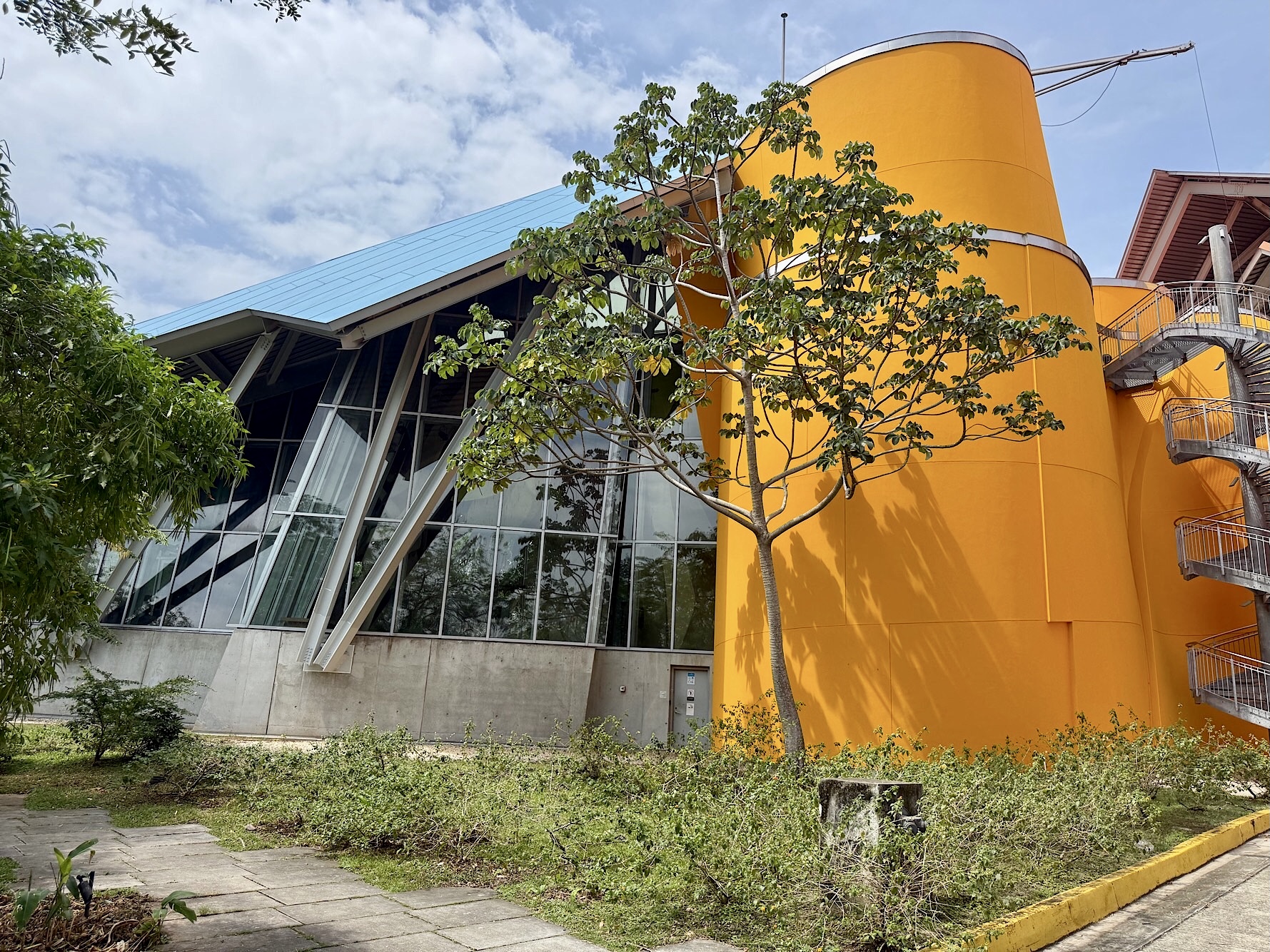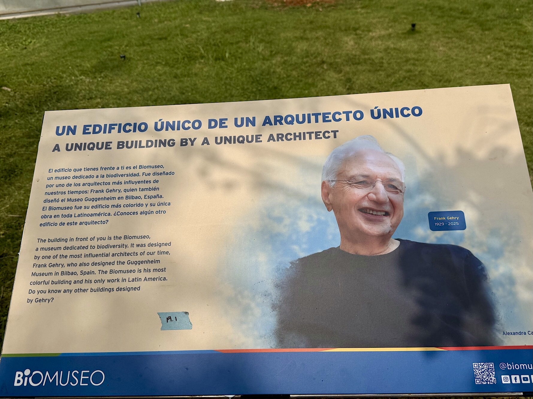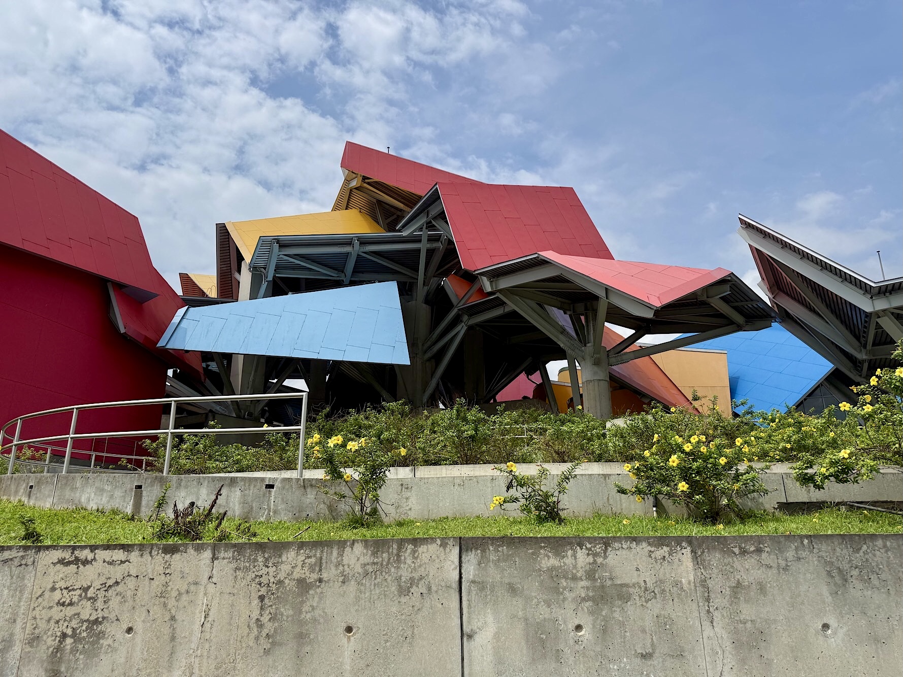 Unser Ziel: das BioMuseo, untergebracht im einzigen Gebäude, das Frank Gehry in Lateinamerika entworfen hat. Bereits zu Beginn der 2000er Jahre plante der Stararchitekt dieses Projekt, eröffnet wurde es 2014. Gehry, der im Dezember 2025 im Alter von 96 Jahren verstarb, hat hier ein Werk hinterlassen, das seine Handschrift unverkennbar trägt: ein kunterbuntes, skulpturales Bauwerk, das wie ein aufgeschlagenes Origami-Buch wirkt. Das Museum zeigt die Kultur- und Naturgeschichte Panamas sowie die ökologischen Folgen der Entstehung des Isthmus von Panama. Es wurde am Amador Causeway, dem Calzada de Amador errichtet. Der Eintrittspreis von 20 Dollar pro Nase schreckt uns ab. Doch schon im Außenbereich gibt es reichlich zu entdecken: die farbenfrohen Dachflächen, die spielerische Architektur, eindrucksvolle Schaukästen zum Thema Panama und die Aussicht auf die Einfahrt des Kanals.