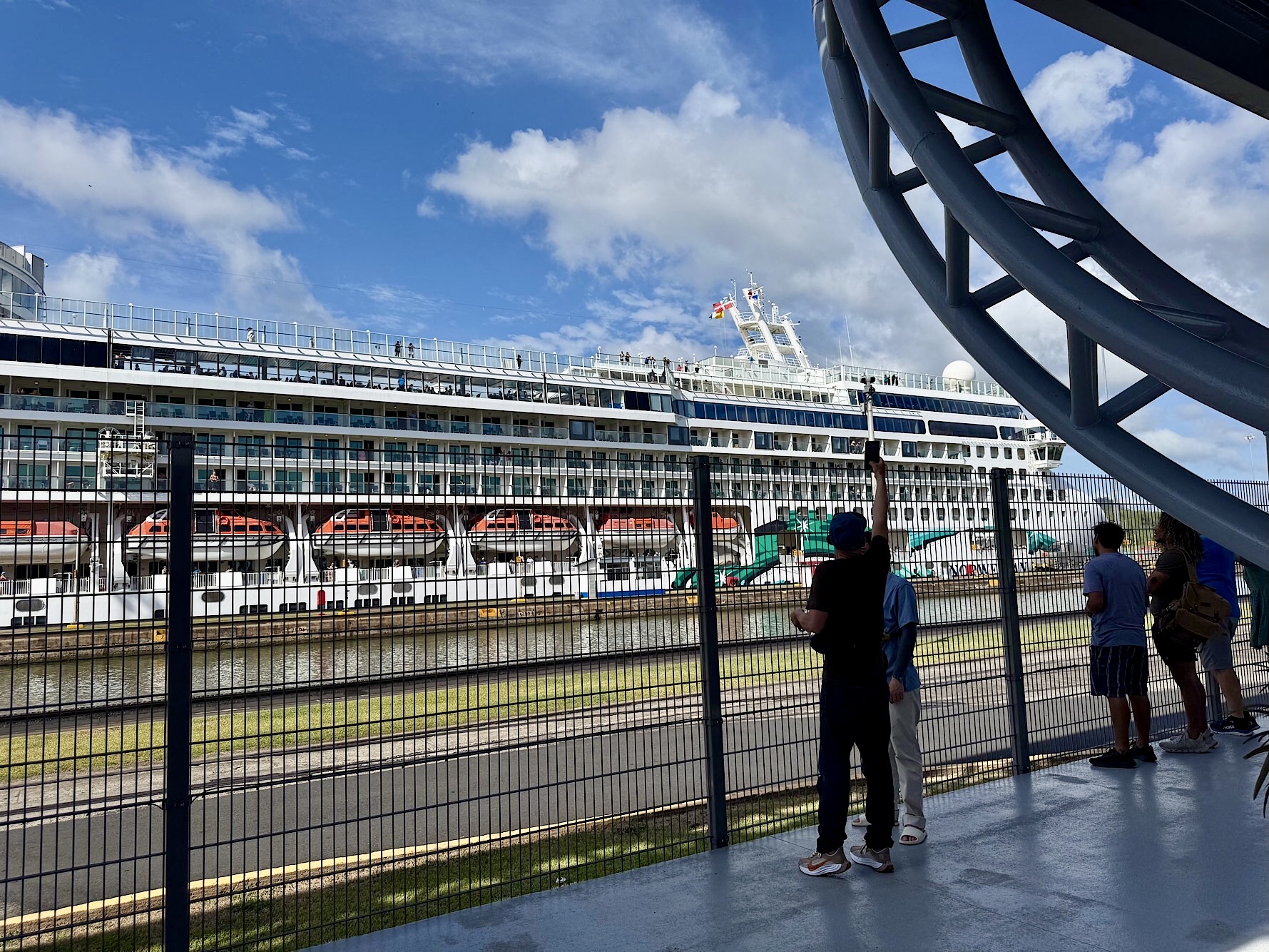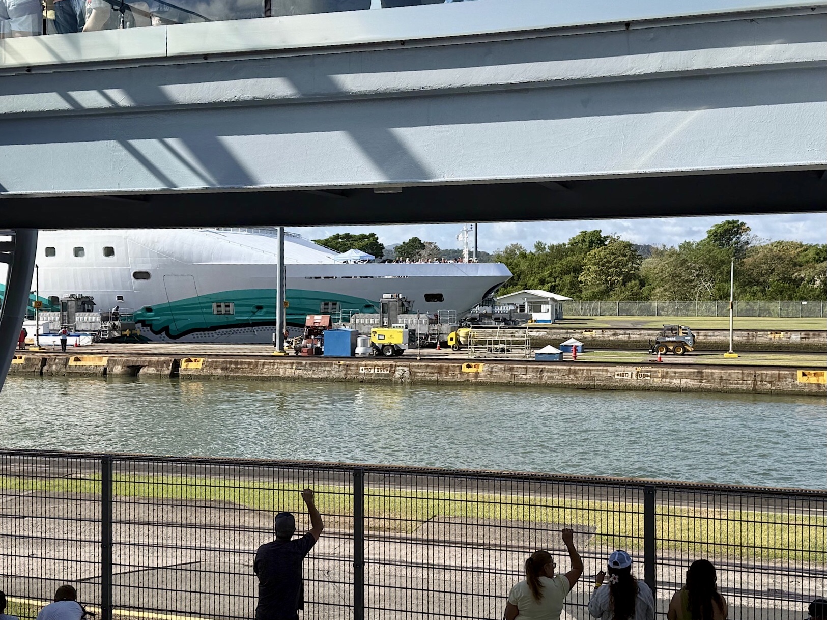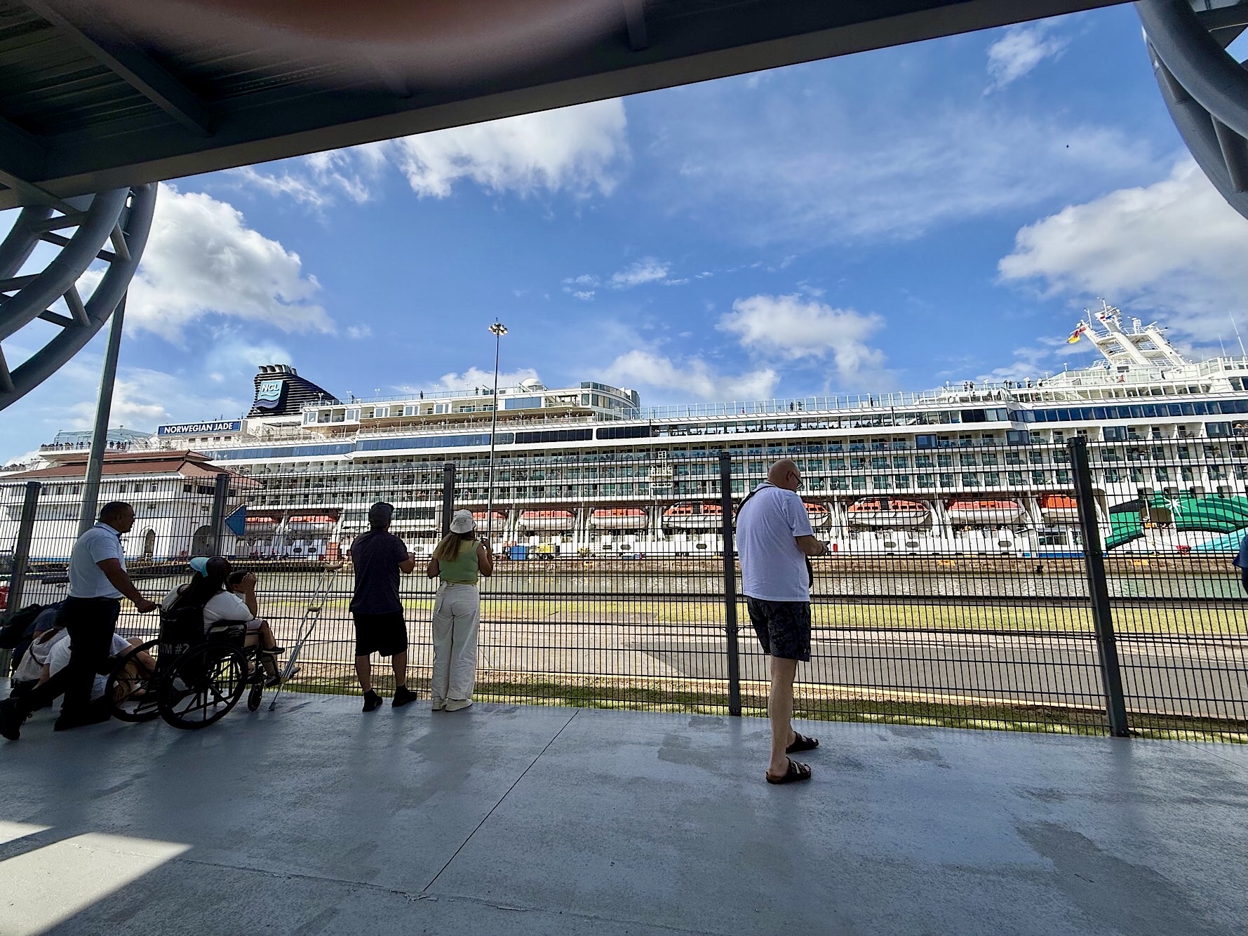 Wir haben Glück: als nächstes fährt die Norwegian Jade ein, ein Kreuzfahrtschiff, das mit chirurgischer Präzision in die Kammer bugsiert wird. Wir bestaunen die Bugsiere, sitzen einfach nur da und gucken uns dieses Schauspiel an.