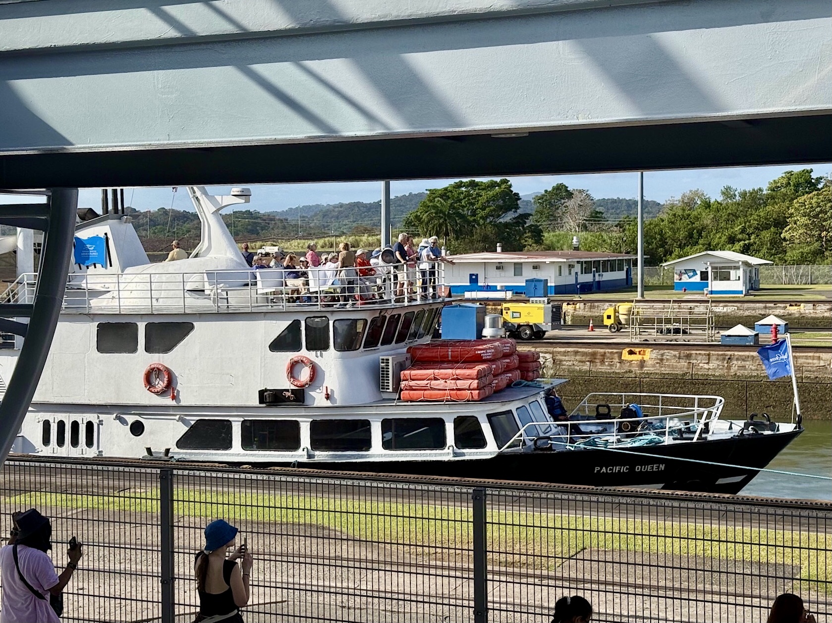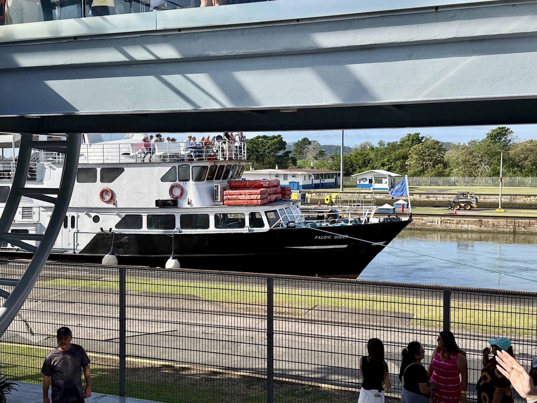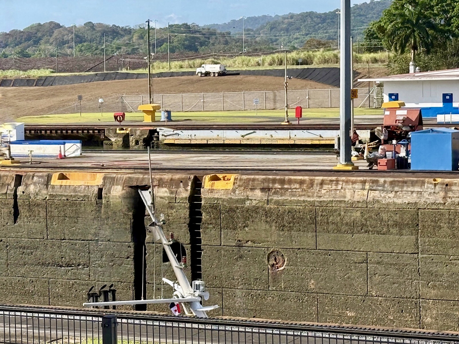 Wir haben Glück: als nächstes fährt die Norwegian Jade ein, ein Kreuzfahrtschiff, das mit chirurgischer Präzision in die Kammer bugsiert wird. Wir bestaunen die Bugsiere, sitzen einfach nur da und gucken uns dieses Schauspiel an.