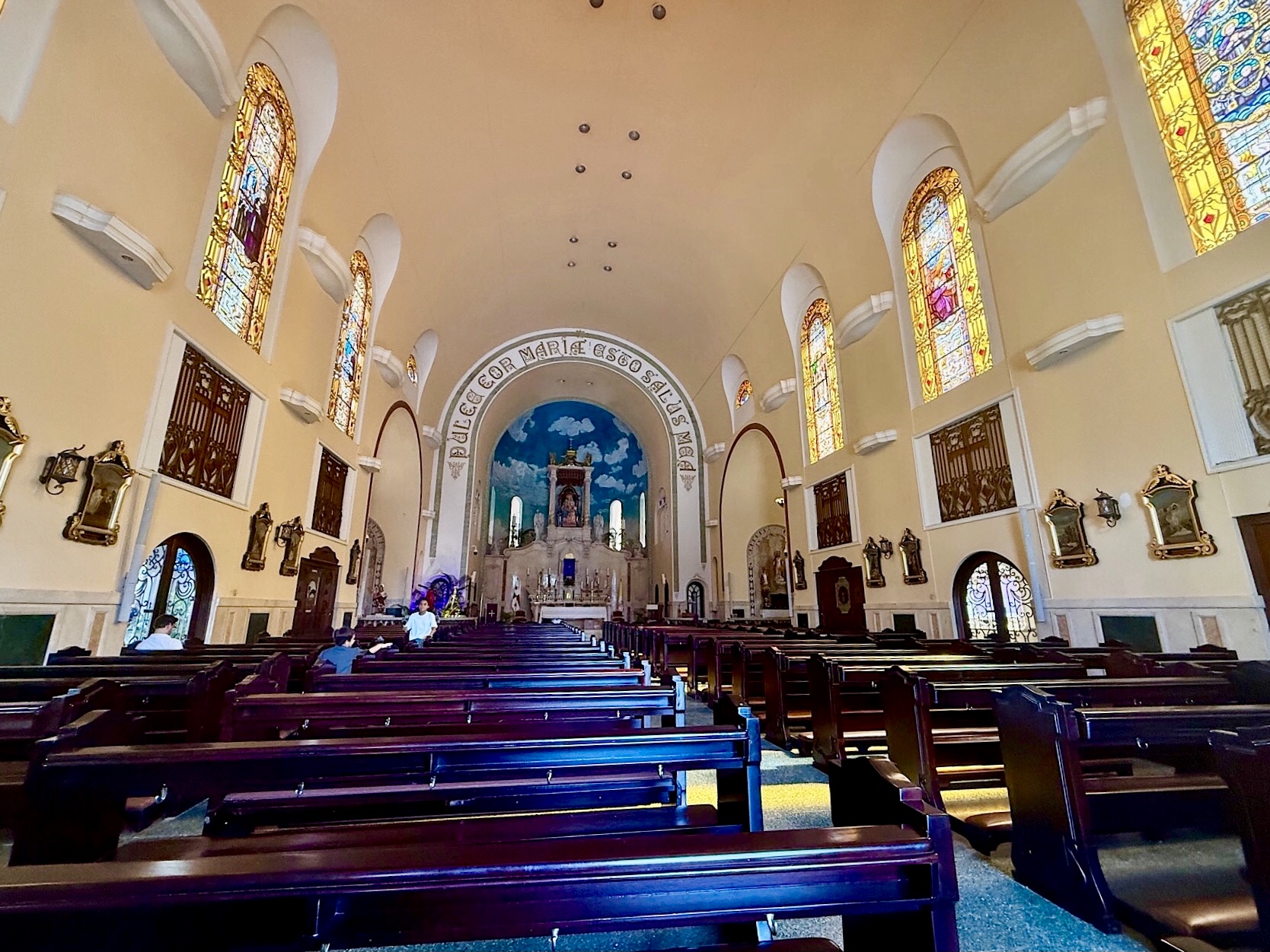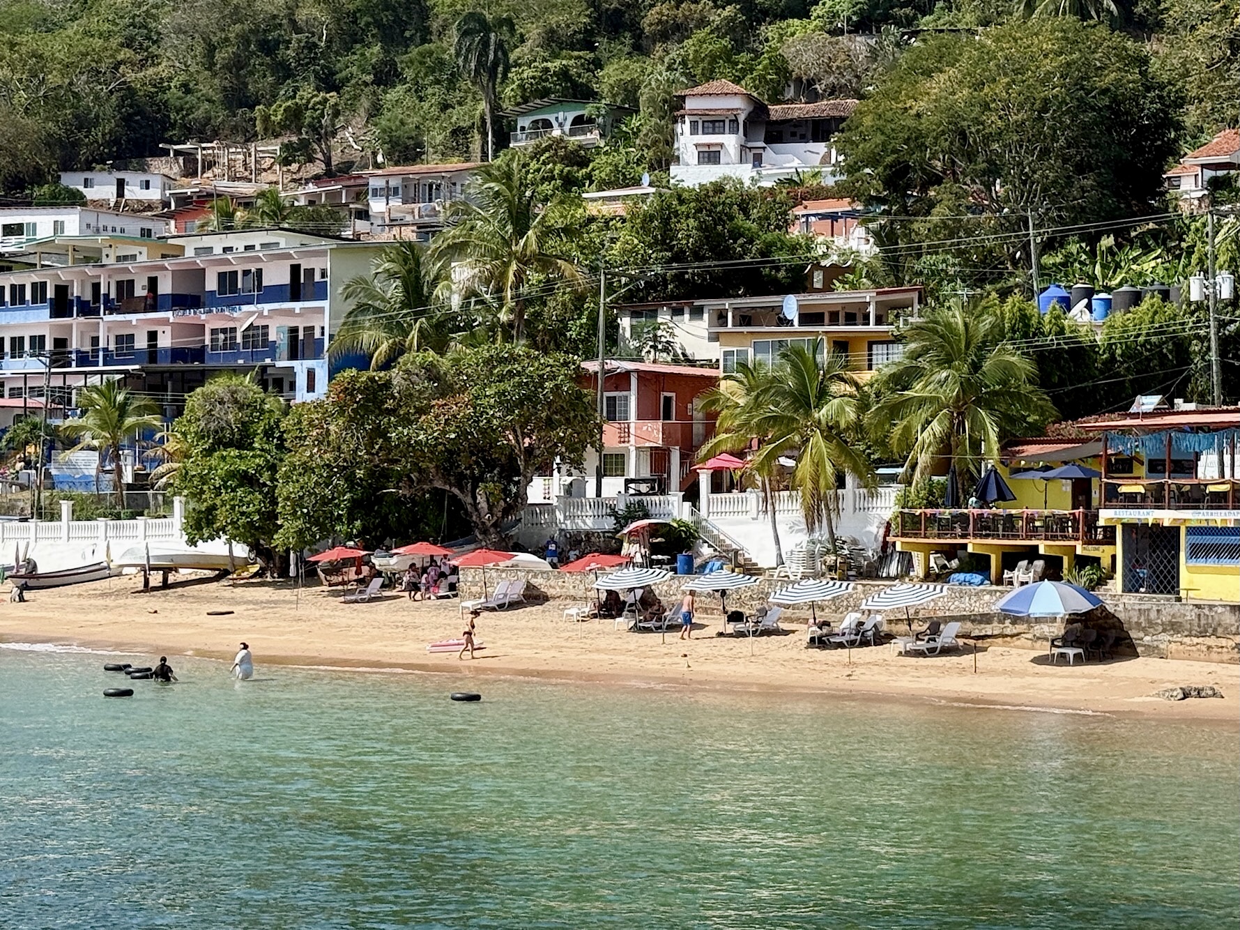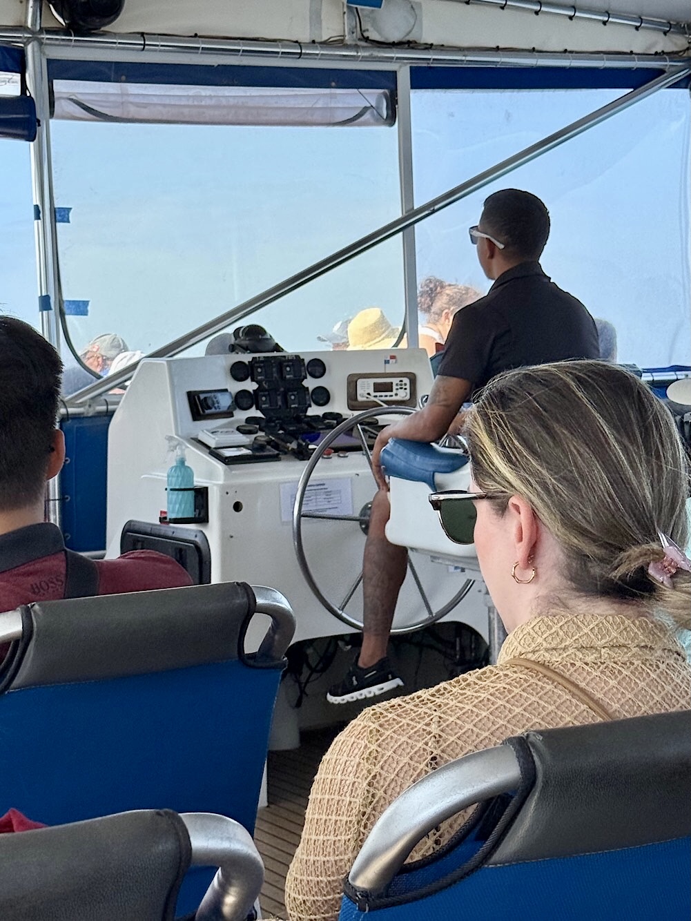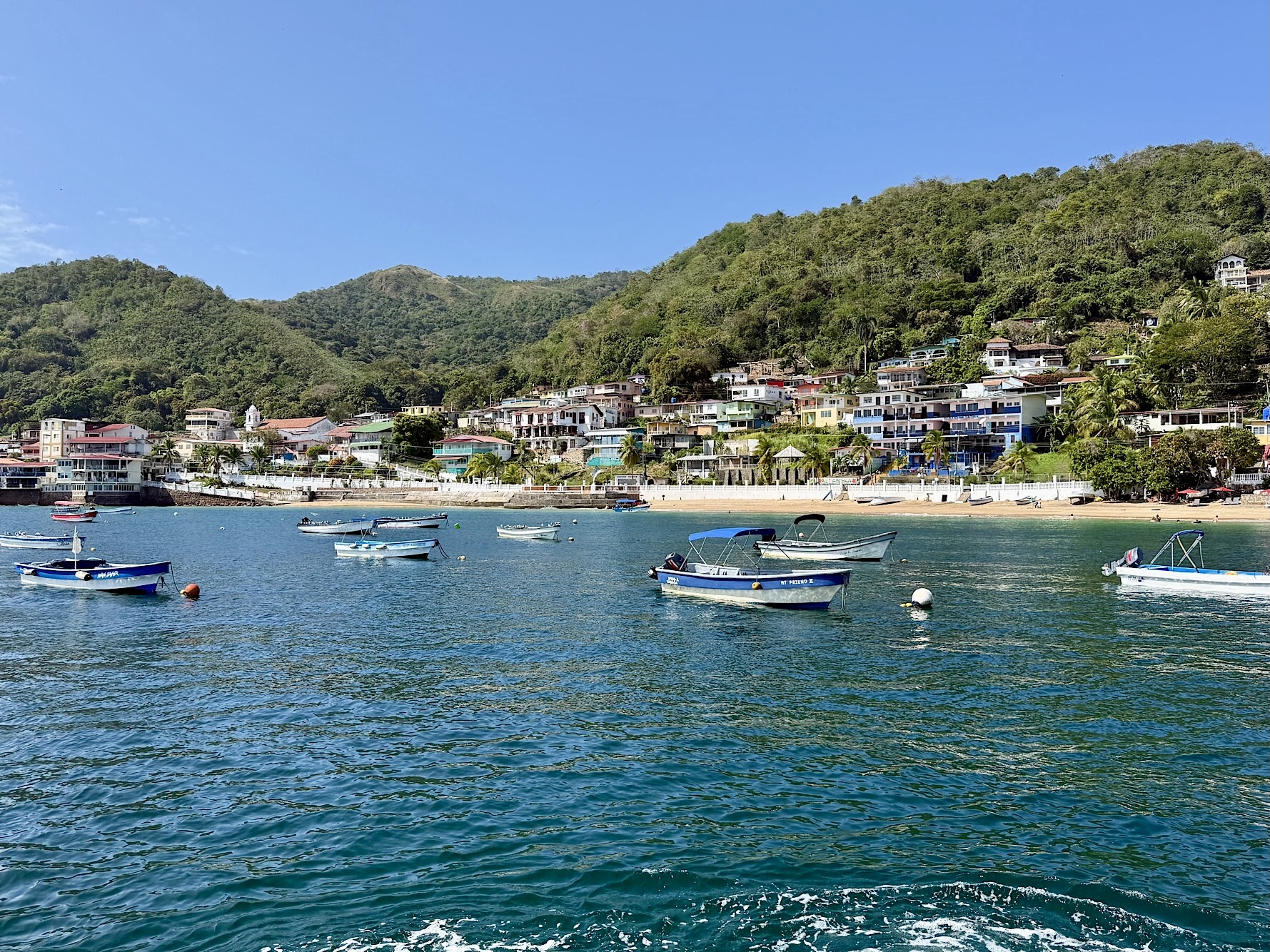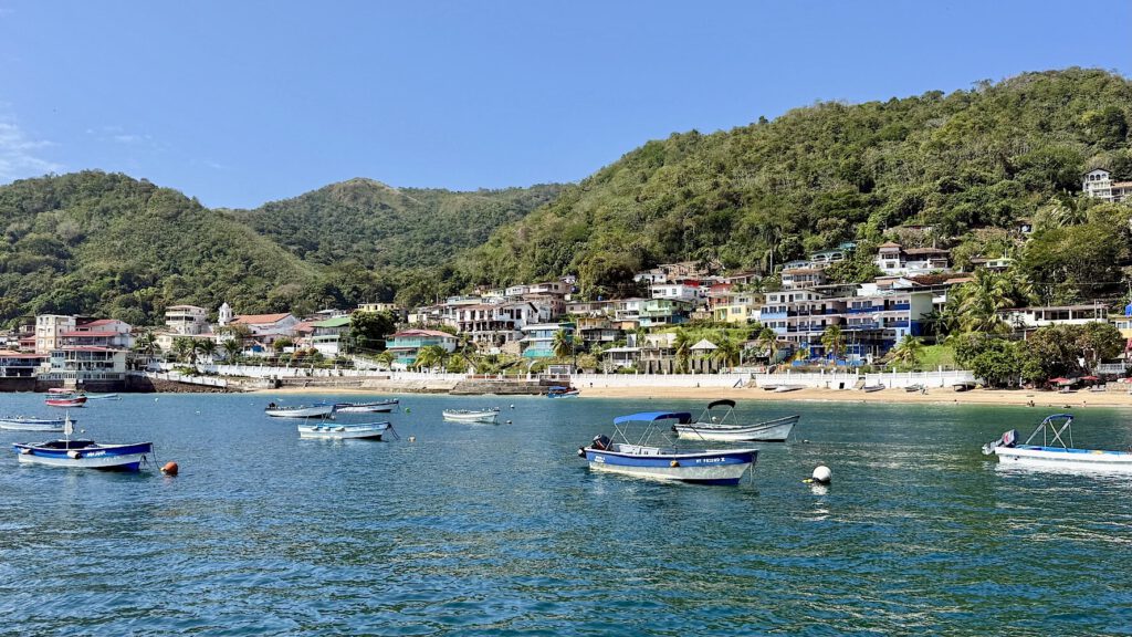Die Insel liegt nur eine halbe Stunde entfernt, wirkt aber wie eine andere Welt. Bunte Häuser, klare Farben, Bougainvilleen über den Gassen. Fischerboote im Hafen, ein Dorfkern, der sich seit dem 16. Jahrhundert kaum verändert zu haben scheint. Die Hitze steht über allem, 33 Grad, gefühlt weit mehr. Wir suchen die Kirche, die wir uns natürlich ansehen: klein, schlicht, aus dem 16. Jahrhundert – und so beschaulich wie die ganze Insel. Wir überlegen kurz, an den Strand zu gehen, entscheiden uns dann aber für ein Frühstück direkt am Wasser. Camerones, Langostinos, ein kühles Getränk, der Blick aufs Meer. Viel mehr schaffen wir nicht.