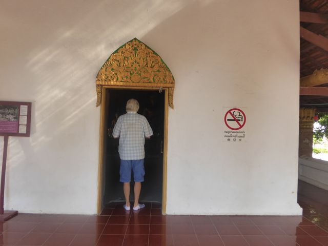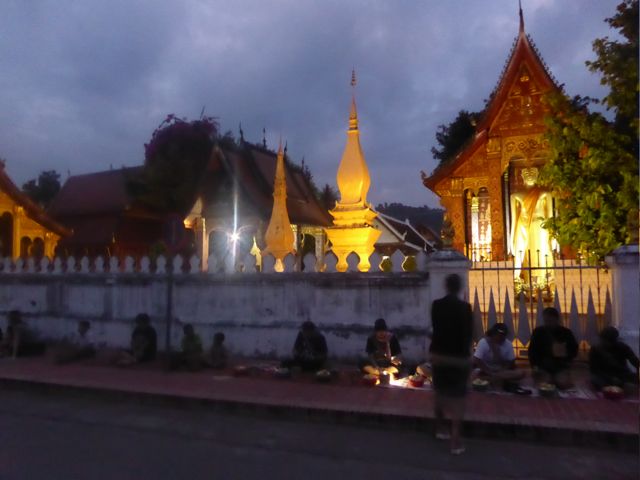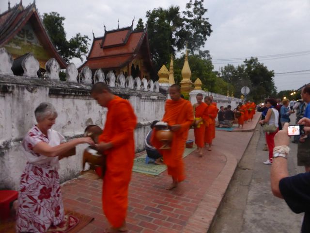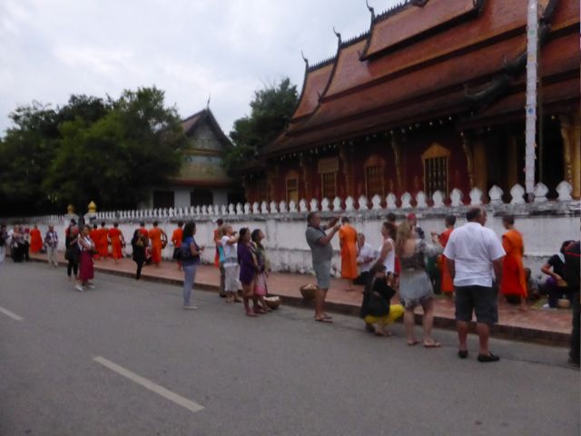 Wer leichtes Fieber hat und keucht, sollte etwas Ruhe halten. Da waren wir uns einig. Mit diesem Gedanken sind wir eingeschlafen. Ich bin um fünf hellwach, Juan kurze Zeit später. Nun gibt es zwei Möglichkeiten: umdrehen und weiterschlafen, aufstehen und den Almosengang der Mönche bei den Tempeln ansehen. Das Thermometer sagt uns 14,5 Grad, das stimmt so sicher nicht. Vorsichtshalber nehme ich ein Jäckchen mit und wir sind ganz gefangen von der Ruhe, die so früh morgens hier in Luang Prabang herrscht. Es ist noch dunkel, als wir kurz vor sechs auf der Hauptstraße eintreffen, aber wir sind natürlich nicht allein. In TukTuks und Minibussen werden von überall her Touristen angekarrt. Einige haben einen Platz auf der Strasse der Mönche bezahlt und machen auf buddhistisch: Schärpe, Klebreis, Handy. Mannomann. Die Handyverlängerung für Selfies sehe ich bei den „Gläubigen“, eine Dreiertruppe macht es sich einfach so in der Reihe bequem…