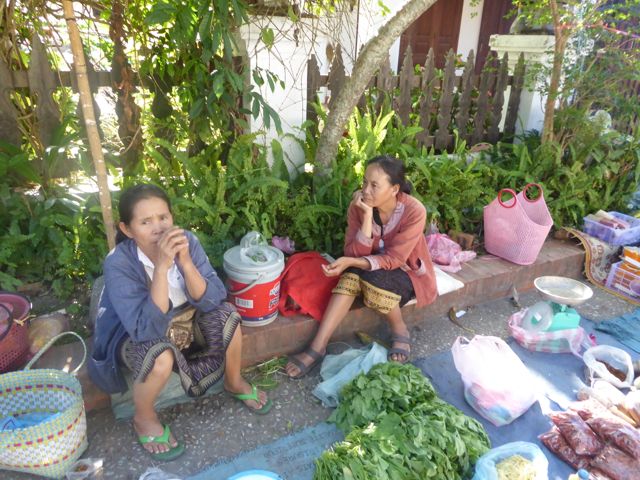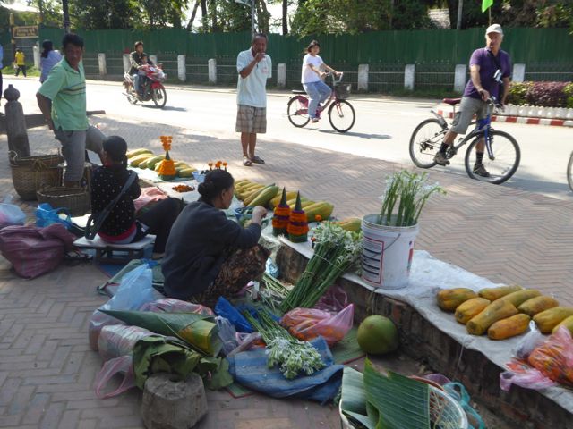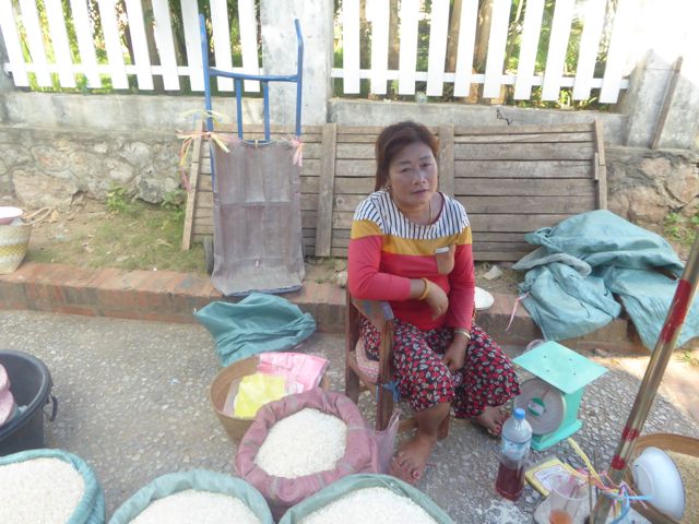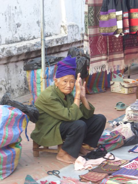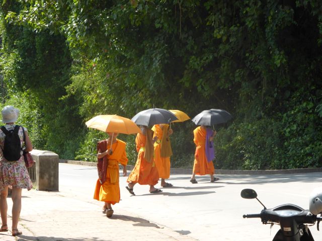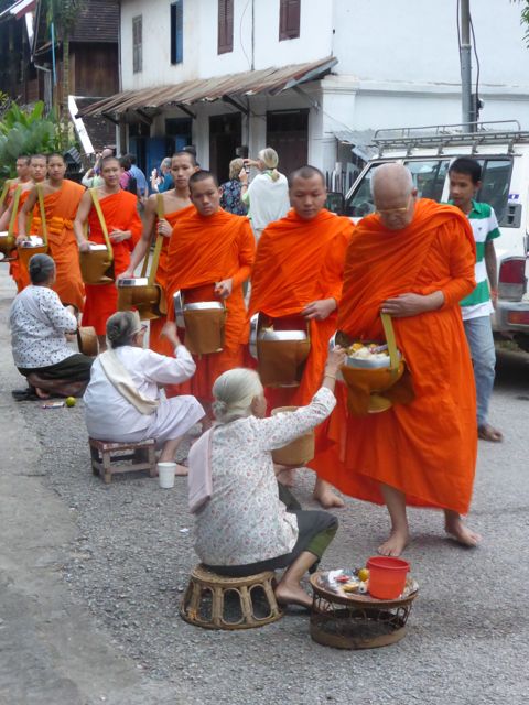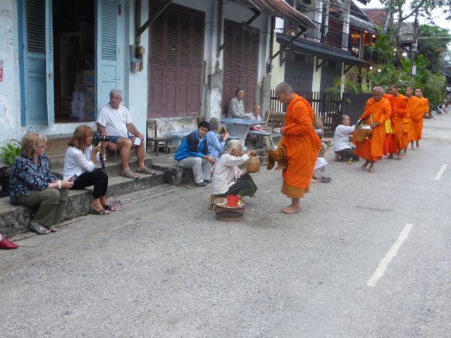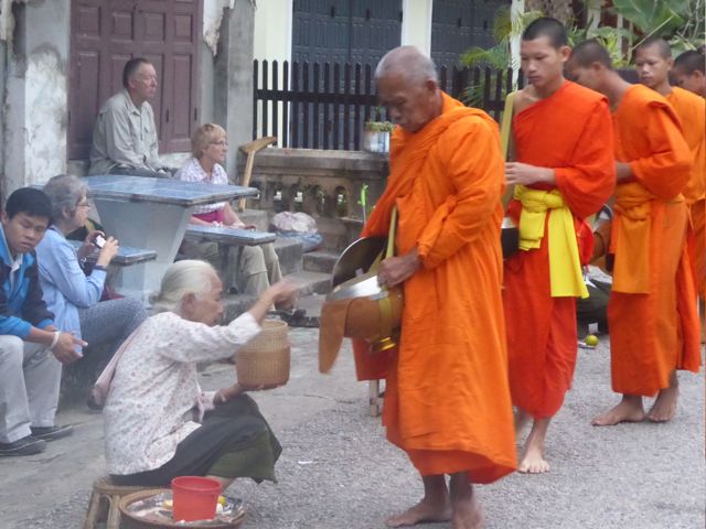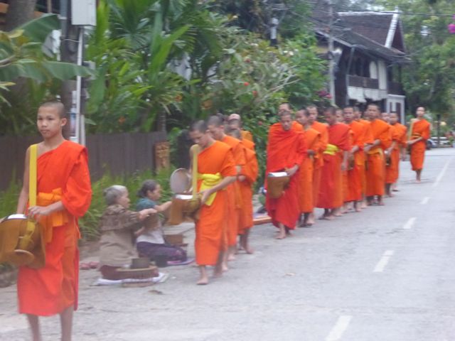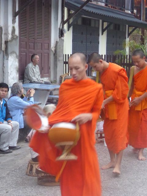 Dann kommen die Mönche: Einige Hundert bitten barfüßig jeden Morgen um ein Almosen, werden belästigt von Blitzen, die sie blenden, von Menschen, die ihnen auf die Pelle rücken, um ein Bild für Facebook oder sonstwas zu kriegen. Im Moment ist Luang Prabang relativ leer. Unvorstellbar, wenn mehr Gedränge herrscht … An einer Stelle warten drei ganz alte Muttchen wie jeden Tag darauf, ihr Almosen zu geben und den Segen zu bekommen. Kurz bevor die Mönche um die Ecke biegen, setzt sich einfach Hennarote (Vorurteile ? Möglich…) dreist direkt in den Weg, nimmt mit untergeschlagenen Beinen Platz und guckt effektheischend nach links und rechts. Nein, nein, ich habe nichts gemacht. Zum Glück kam ein Offizieller daher und vertrieb sie trotz der Diskussionen, die sie ihm noch aufdrängen wollten. Weibsvolk! Die Mönche marschierten buddhaergeben an den Gläubigen und an den Wichtigtuern vorbei. Nach innerer Einkehr und spiritueller Ruhe sah dieses dennoch unvergessliche Erlebnis nicht aus…