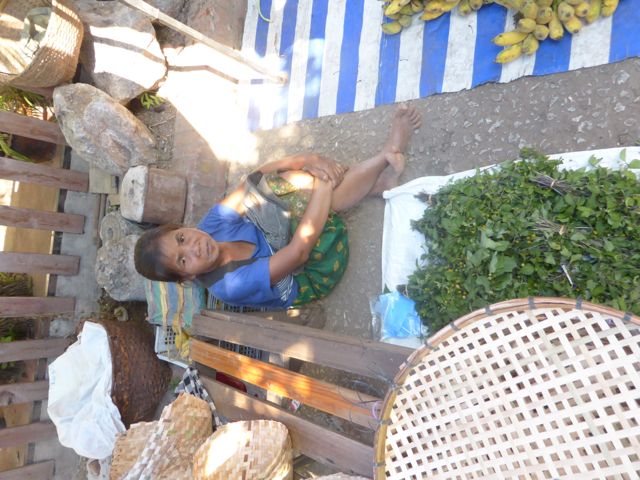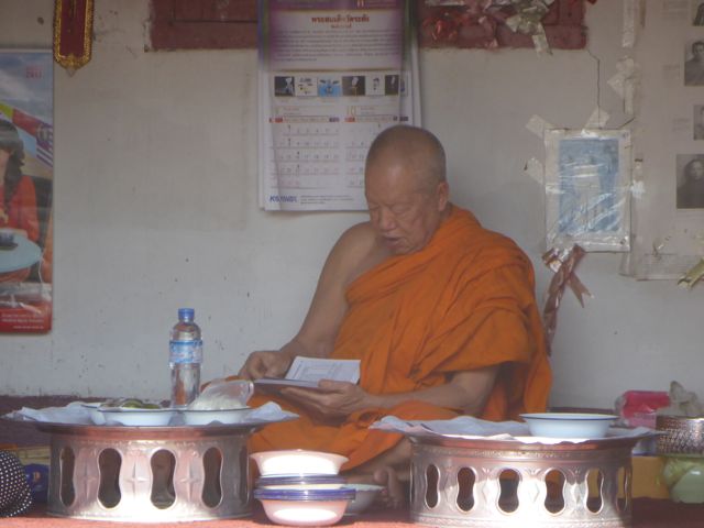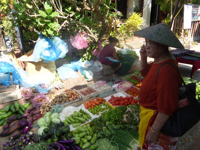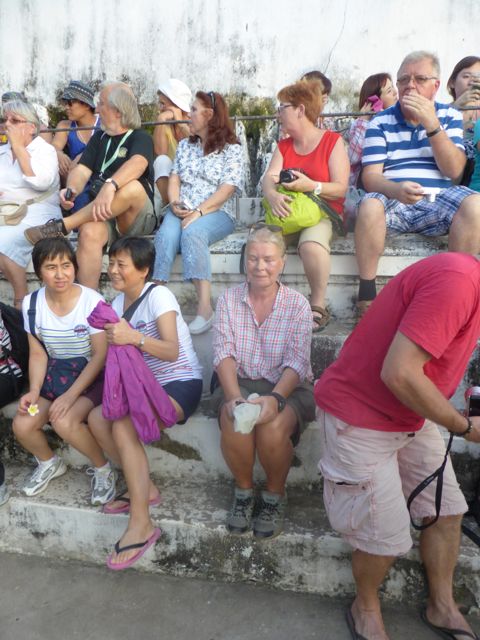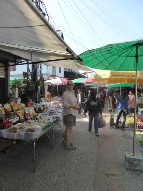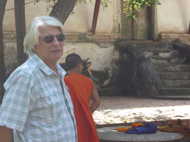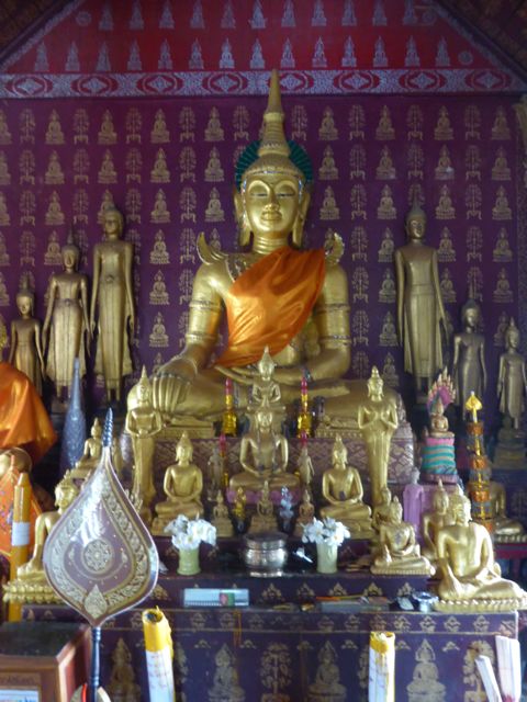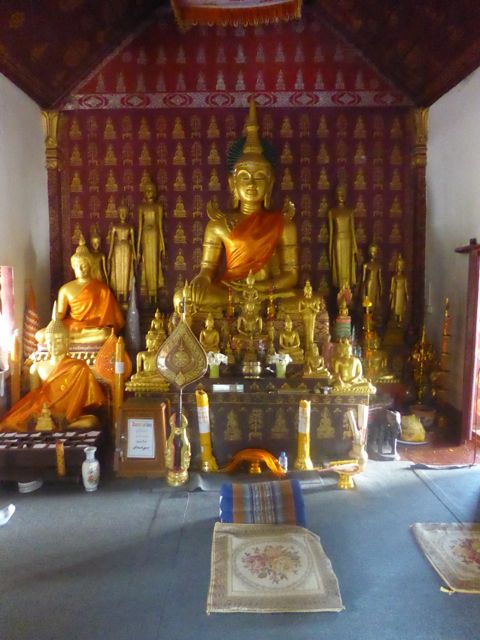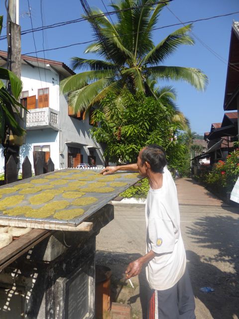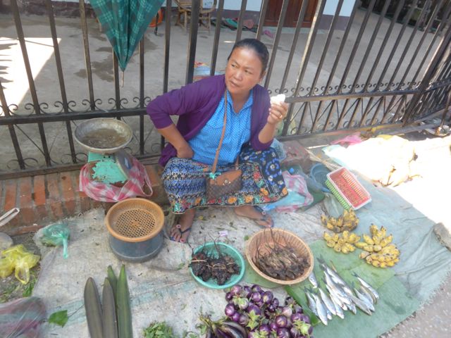 Dann kommen die Mönche: Einige Hundert bitten barfüßig jeden Morgen um ein Almosen, werden belästigt von Blitzen, die sie blenden, von Menschen, die ihnen auf die Pelle rücken, um ein Bild für Facebook oder sonstwas zu kriegen. Im Moment ist Luang Prabang relativ leer. Unvorstellbar, wenn mehr Gedränge herrscht … An einer Stelle warten drei ganz alte Muttchen wie jeden Tag darauf, ihr Almosen zu geben und den Segen zu bekommen. Kurz bevor die Mönche um die Ecke biegen, setzt sich einfach Hennarote (Vorurteile ? Möglich…) dreist direkt in den Weg, nimmt mit untergeschlagenen Beinen Platz und guckt effektheischend nach links und rechts. Nein, nein, ich habe nichts gemacht. Zum Glück kam ein Offizieller daher und vertrieb sie trotz der Diskussionen, die sie ihm noch aufdrängen wollten. Weibsvolk! Die Mönche marschierten buddhaergeben an den Gläubigen und an den Wichtigtuern vorbei. Nach innerer Einkehr und spiritueller Ruhe sah dieses dennoch unvergessliche Erlebnis nicht aus…