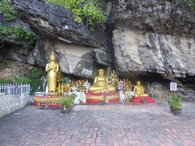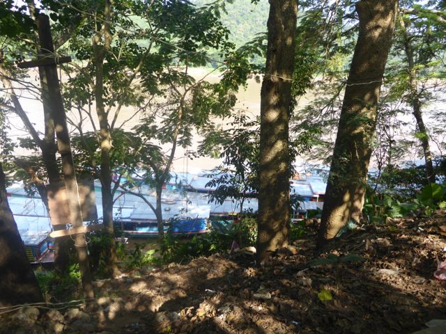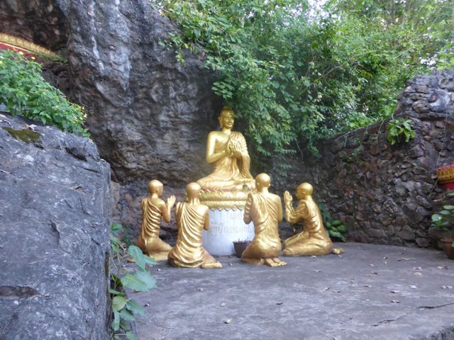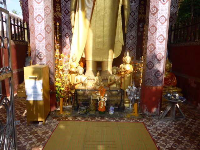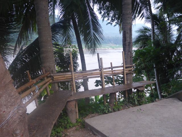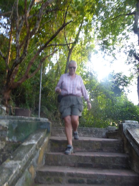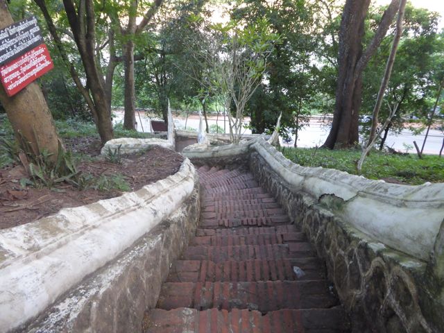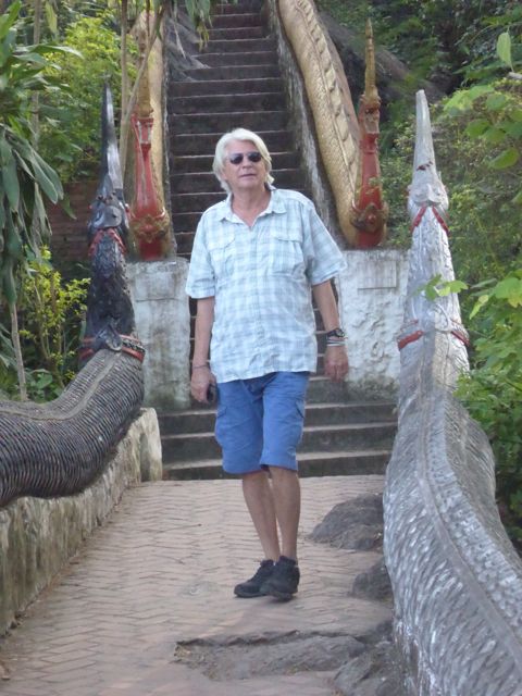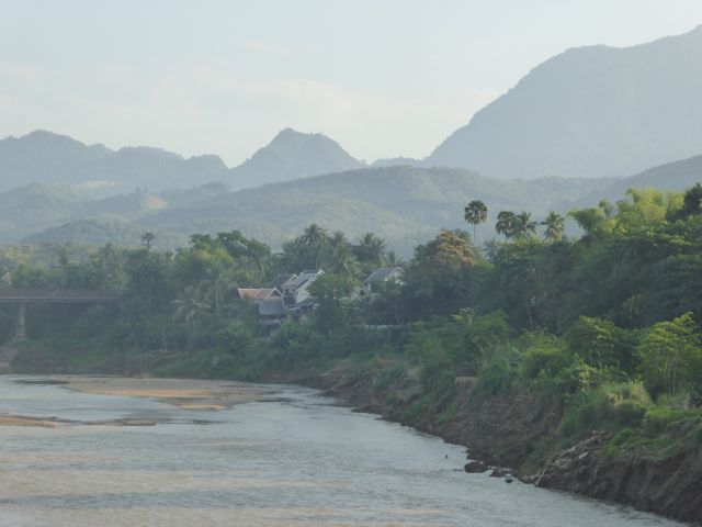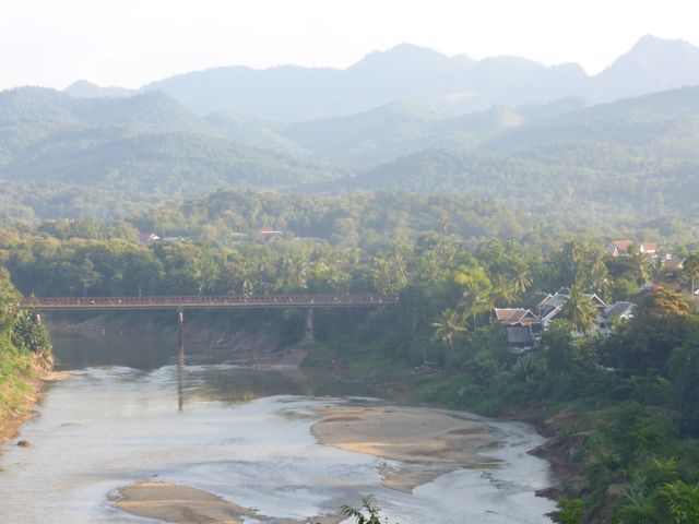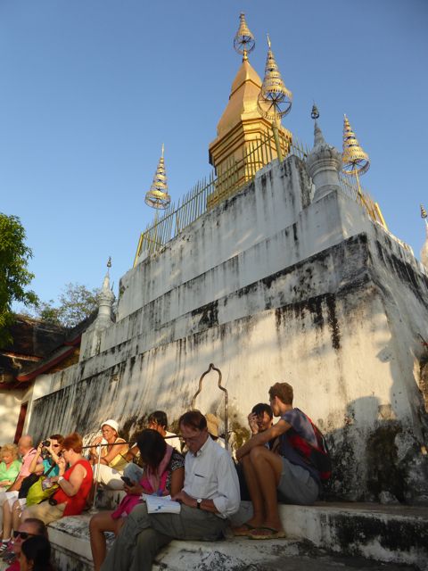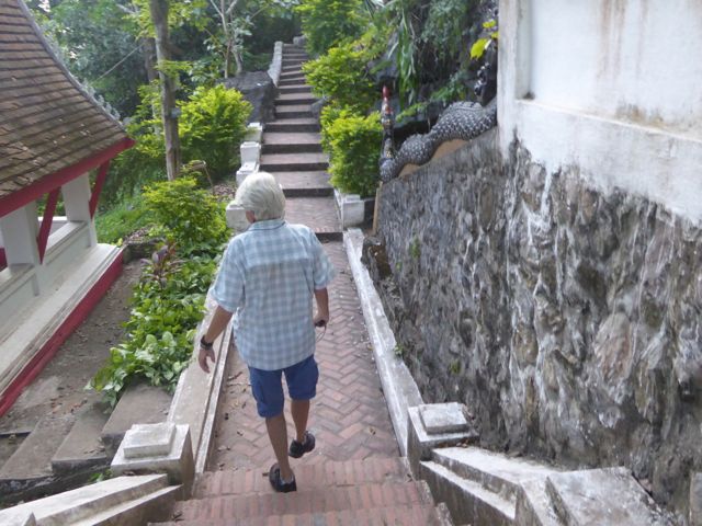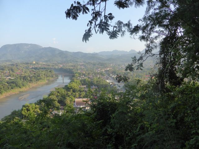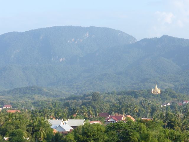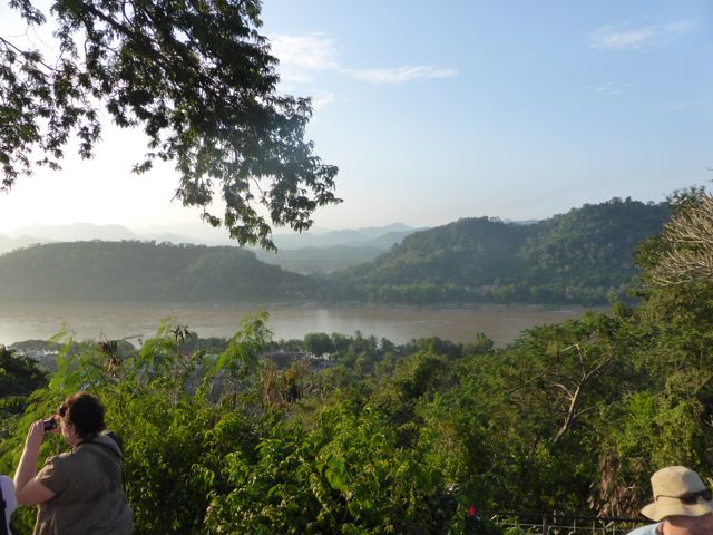 In einer kleinen Kneipe über dem Fluss gibt es das Bier, dann erst einmal Siesta. Trotz der Action. Ist mein Fieber gesunken – alles gut. Aber ein bisschen Ruhe ist dringend notwendig, denn wir haben für heute noch einen Plan. Gegen halb vier Waschen Sir und den Schlaf aus den Augen und machen uns auf dem Weg zum Mount Phousi. Hundert Meter hoch, mitten auf der Halbinsel, gekrönt von einer goldenen Stupa. Aber der Weg, der Weg… 350 Treppen hoch, ich keuche nur noch, brauche Pausen. Vorbei an Tempeln, Buddha-Statuen und dem Fussabtriit Buddhas in einer kleinen Höhle zahlen wir auf halber Strecke 20000 Eintritt pro Person. Oben angekommen, ist Juan noch recht frisch, ich nicht… Es gibt unter der Stupa ein paar Treppen, die sind so gut wie besetzt. Viele Franzosen, Francokanadier, Deutsche, Australier, Mexikaner. Und wir. Mir ist es auf der Stelle zu eng hier oben. Zwar ist der Blick toll, aber den Sonnenuntergang sehen wir lieber am Fluss, bevor die ganze Schar die 350 Treppen hinuntertobt. Das war eine gute Entscheidung, denn immer mehr Menschen keuchen jetzt noch die Treppen hoch.