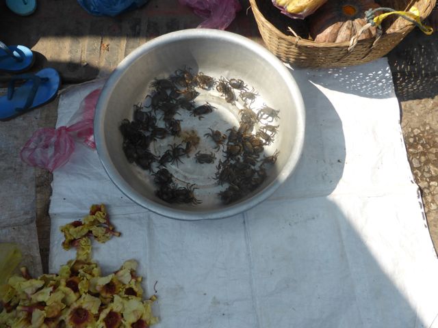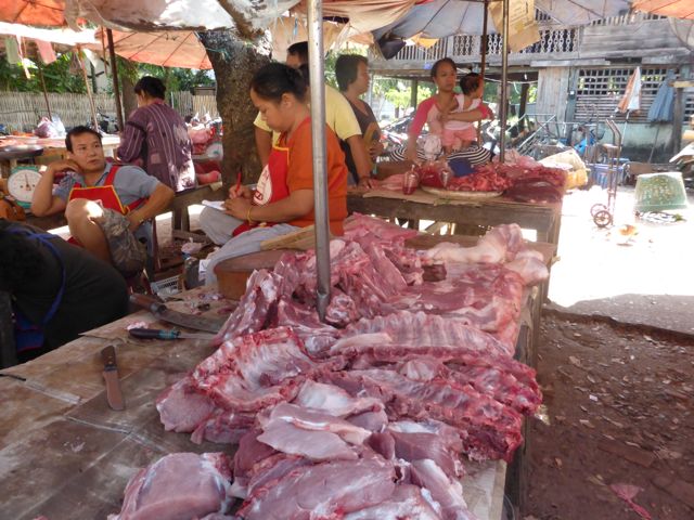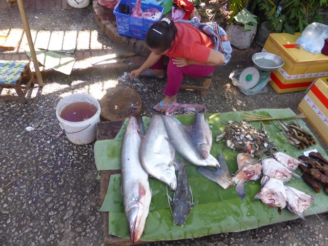 Inzwischen ist die Sonne aufgegangen, Zeit für Dusche, Rasur und Frühstück. Kurze Zeit später sind wir schon wieder auf die Rue (französisches Kolonialerbe!), weil wir ein paar Tempel, eventuell auch das Nationalmuseum besuchen wollen. Es kommt, wie es kommen muss: Wir finden uns auf einem Markt wieder. Hier sind kaum noch Touristen zu sehen, dafür einige Spezialitäten, zu denen auch getrocknete Ratte gehört. Muss man mögen, muss man nicht probieren. Auf dem Markt vertrödeln wir so viel Zeit, dass das Museum schon mal Mittagspause macht. Egal, es ist zwar wieder heiß, aber ein paar Ecken weiter soll es noch einen Markt geben.