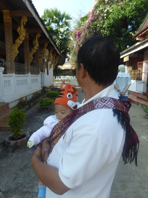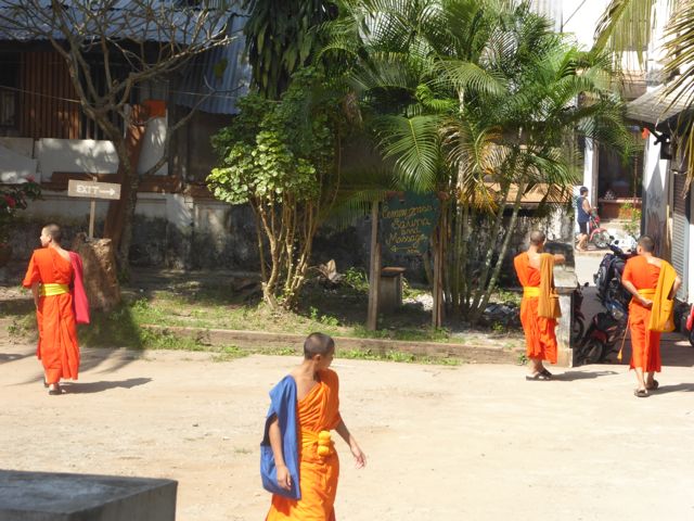 Auf dem Weg zum Fluss (=kaltes Beer Lao) kommen wir noch an einem Tempel vorbei, aus dem unzählige Mönchen strömen. Wohl eine Schule oder so… Wir gucken, wir staunen, wir sind begeistert.