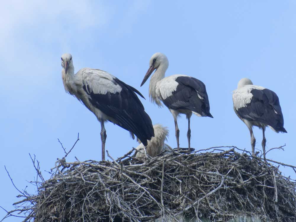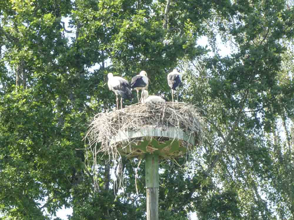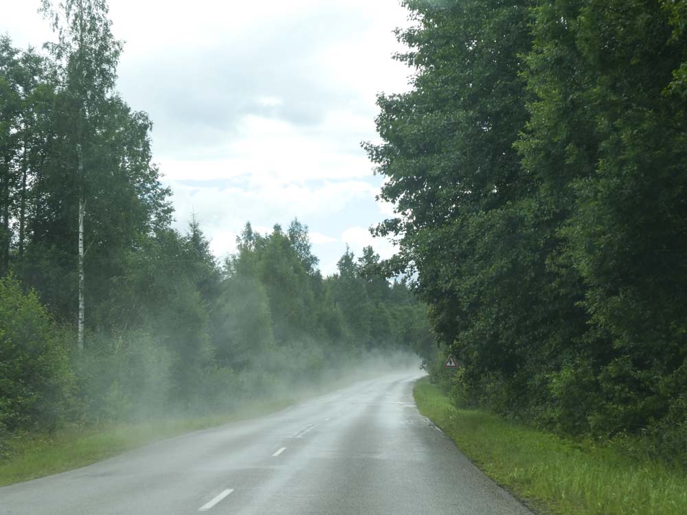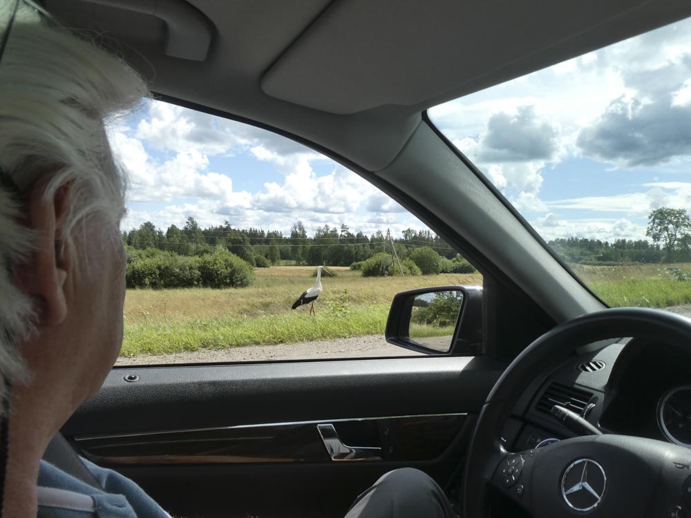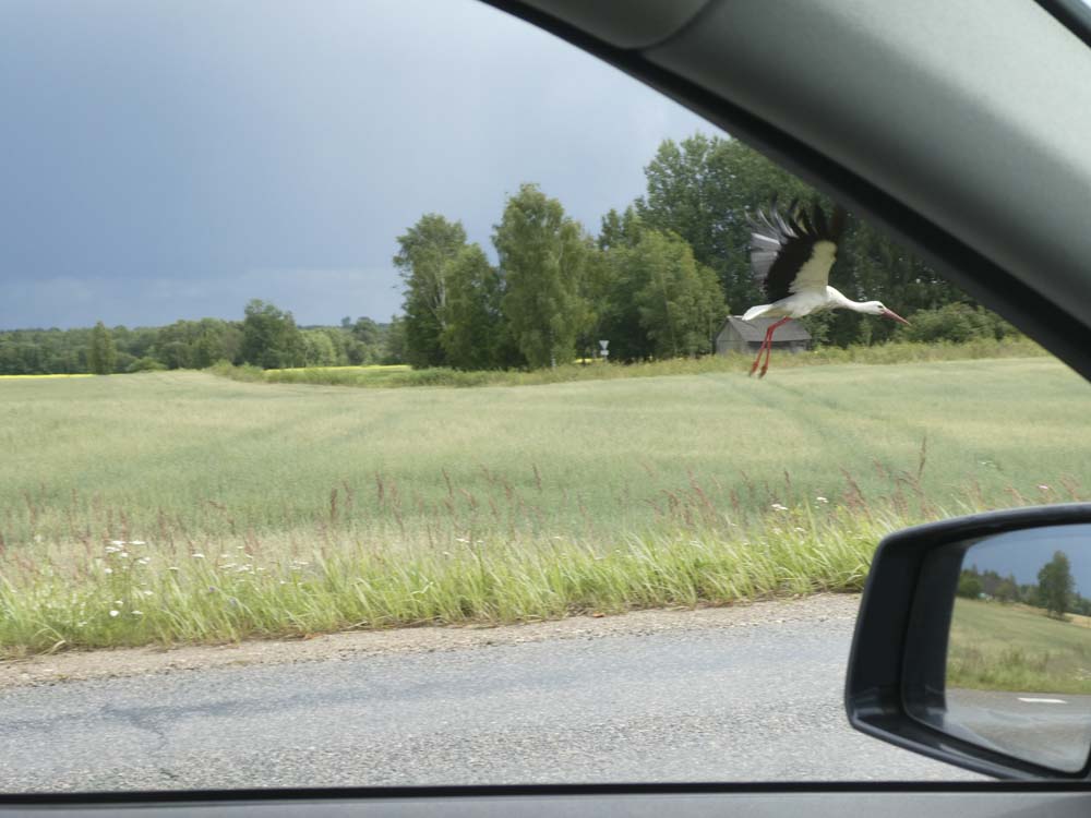 Hinaus aus Estlands zweitgrößter Stadt geht es bei dunkel aufziehenden Wolken Richtung Süden. Wir sind ziemlich sicher: Kaum ein Este ist in diesem Land so rumgekommen wie wir! Als der erste Regen einsetzt, sind wir auf irgendeiner Ruckelpiste unterwegs, die uns in einen Nationalpark südlich von Vöru führt. Unseren Deal – wer was zahlt, wenn er den ersten Bären, Elch oder sonstwas sieht – haben wir ausgesetzt. Prompt treffen wir auf eine Handvoll Mönchskraniche, später auf die ersten Rehe seit Winsen/Luhe. Inzwischen verdichtet sich aber unser Verdacht, dass die Störche all die großen Tiere weggefressen haben… So viele wohlgenährte, selbstbewusste Störche… Naja, Theorien unter dunklem Hinmel.