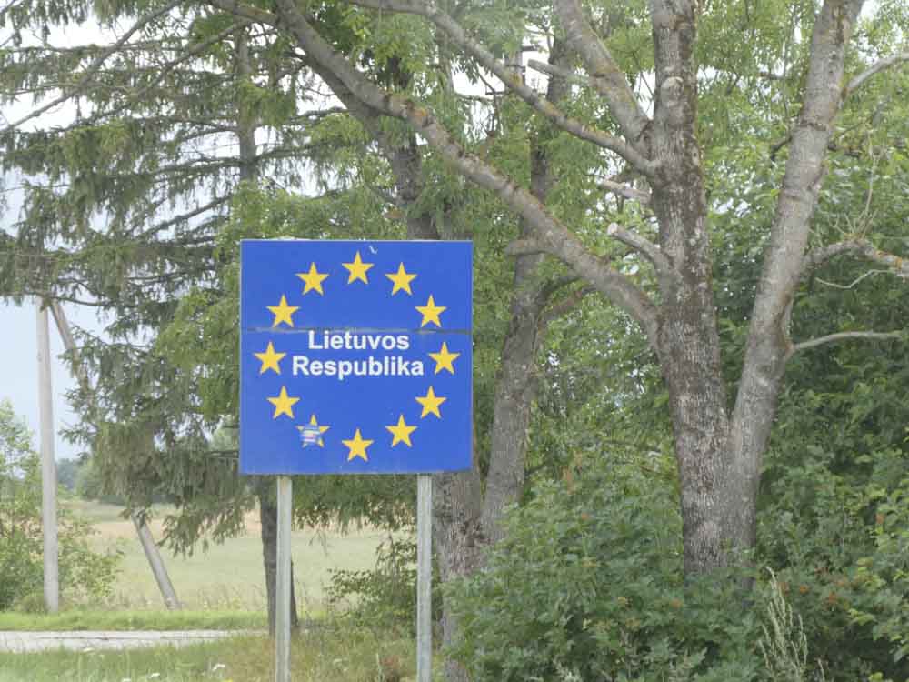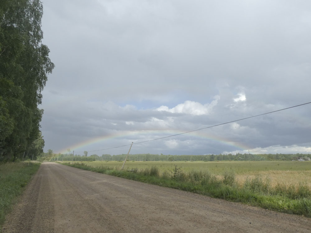 Hinter dem gottverlassenen Nest Akniste rutschen wir auf Schotter aber unter einem Regenbogen über die Grenze nach Litauen nach Juodope. Hilft alles nichts: Weiter. Benzin kostet hier 1,01, aber dafür gibt es keinen Kaffee.
