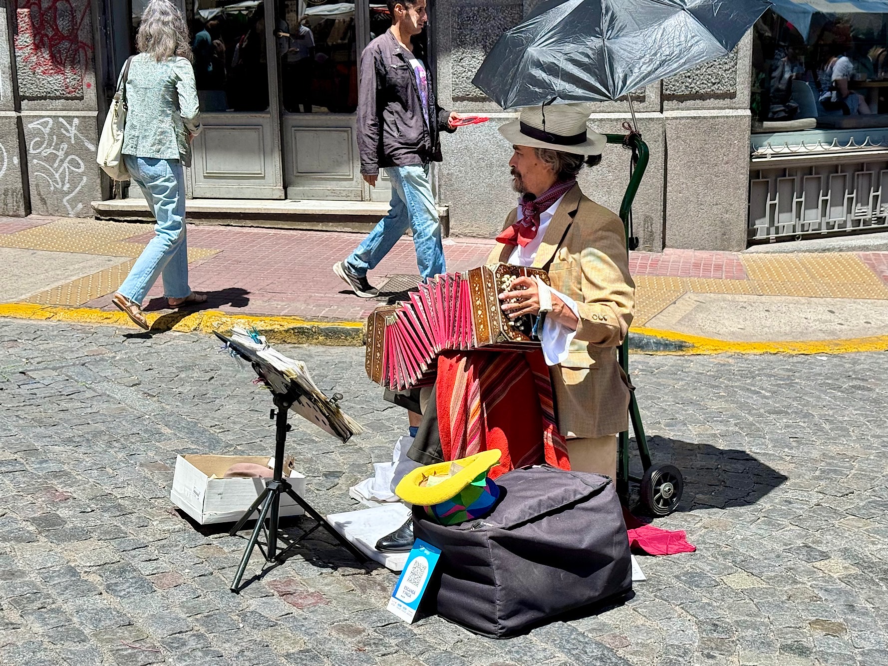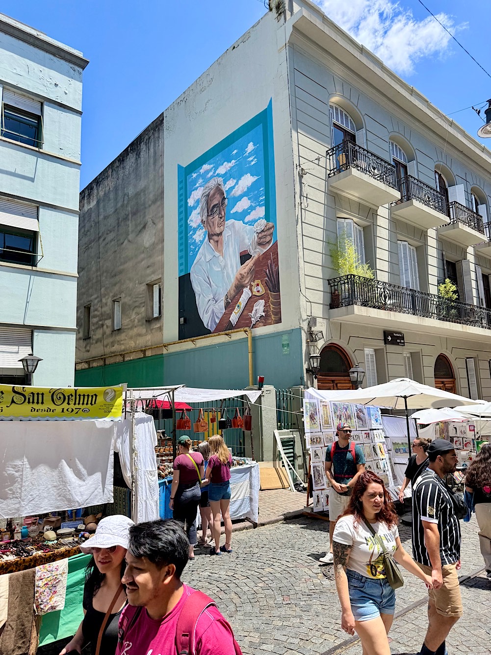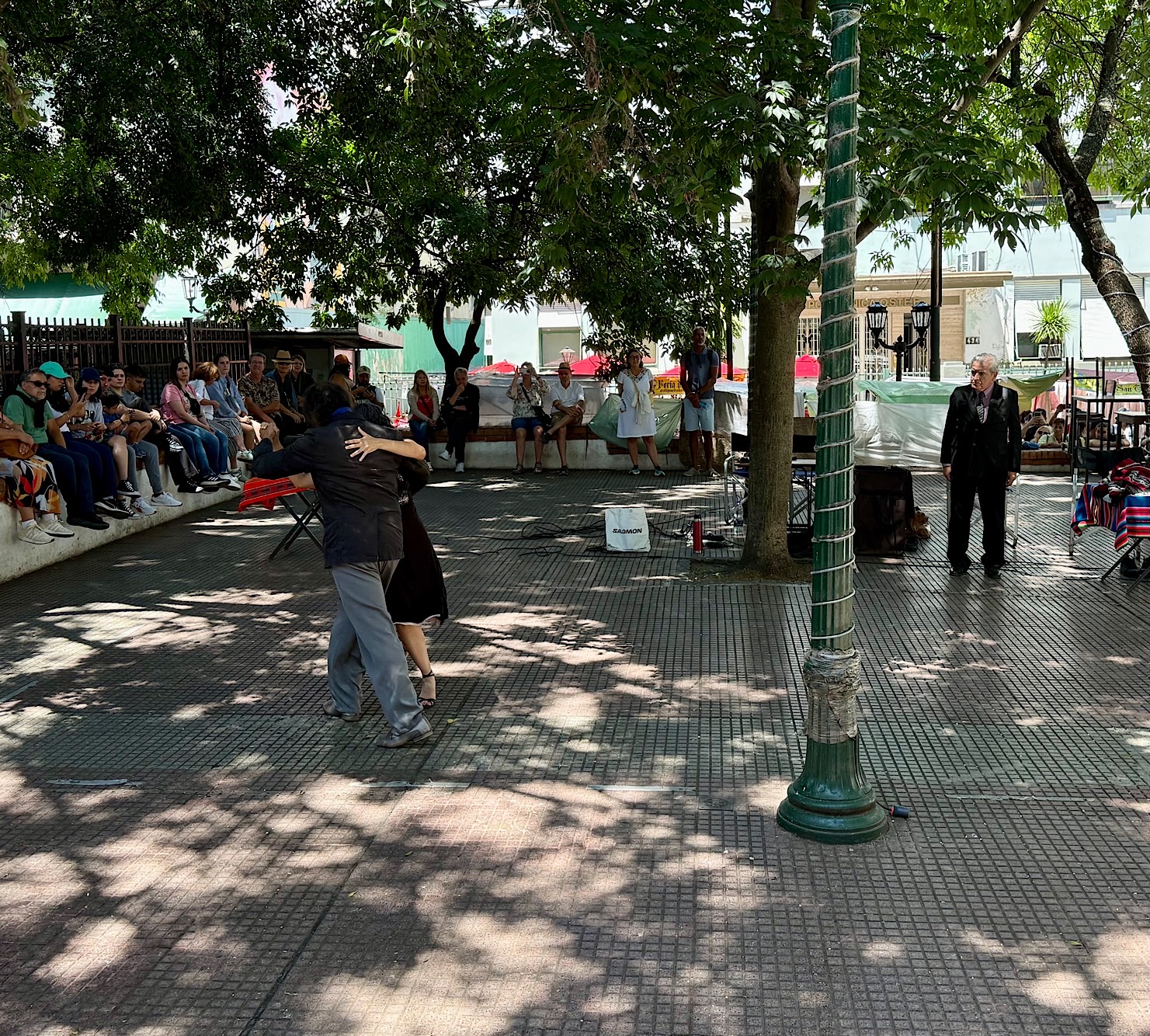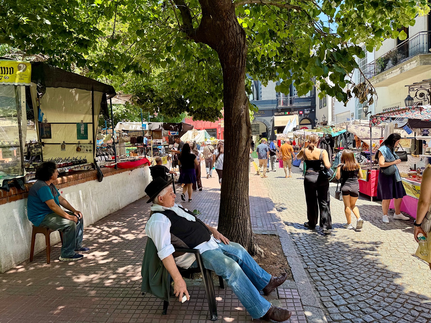 Die Plaza Dorrego ist der zentrale Punkt des Marktes. Straßenkünstler und Tangotänzer gehören zum Bild, doch sie wirken weniger wie eine Inszenierung als wie ein fester Bestandteil des Viertels.