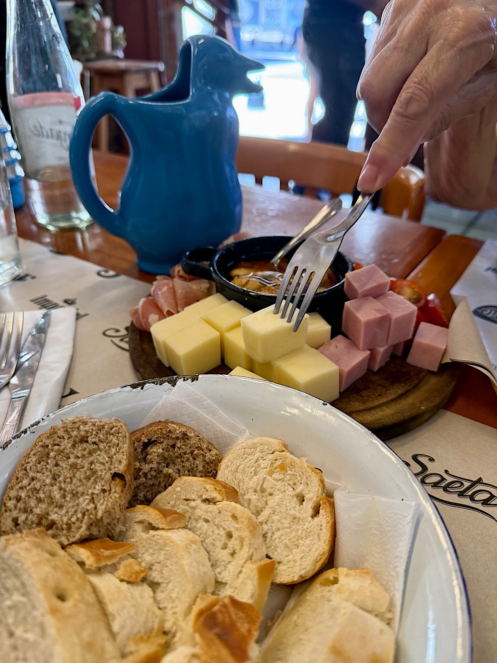 Wir halten bei sommerlich-gemäßigten Temperaturen von um die 25 Grad Ausschau nach einem Ort für einen leichten Mittagssnack. Leider ist das La Poesia bis auf den letzten Platz besetzt. Also weiter. Das Suelta kriegt uns, die kolumbianische Truppe kümmert sich rührend. Wir wollen eine kleine Aufschnitt-Köseplatte. Gibt es nicht auf der Karte, aber aus der Küche. Improvisation ist Teil der normalen Lebensweise.