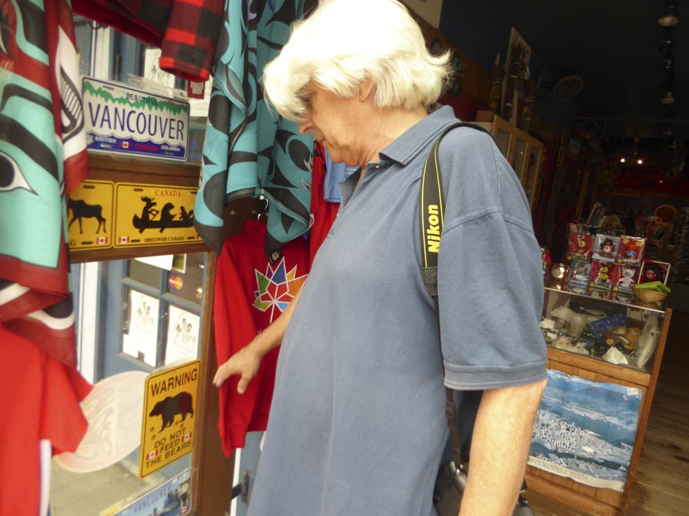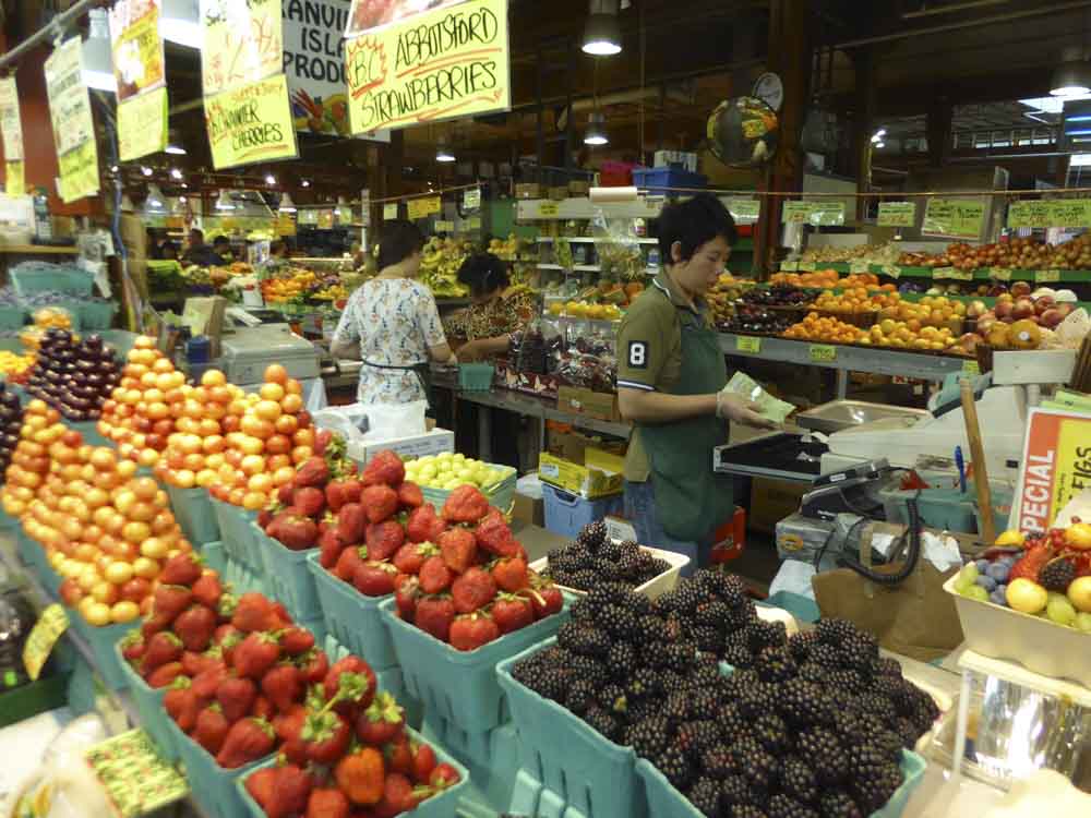 Also gucken wir uns Granville Island an. Abends tobt sich hier in diesem Stadtviertel die Kunstszene mit Theater, Musical und Konzerten aus, tagsüber konzentriert sich das Leben überwiegend auf den Public Market, die Markthallen. Das ist ja mal wieder genau unsere Welt. Hier gibt es grossartiges Obst, knackfrisches Gemüse, hervorragendes Fleisch, sogar im Brotbacken versuchen sie sich, was mit einer Schippe Salz zweifelsfrei besser gelingen könnte. Aber es geht ja auch ums Bemühen. Der Ort ist schön, durch die Hallen unter den Brücken und die direkte Anbindung ans Wasser mitsam Yachthafen gibt es ein besonderes, sehr schönes Flair. Wir gucken an, was anzugucken ist und lächeln ein bisschen über den Farmers‘ Market vor der Tür, der winzig klein ist. Fast hätten wir ihn übersehen. Hier gibtves dreimal so teures Obst wie in den Markthallen, Kunstgewerbliches und ökologisch eventuell Einwandfreies.