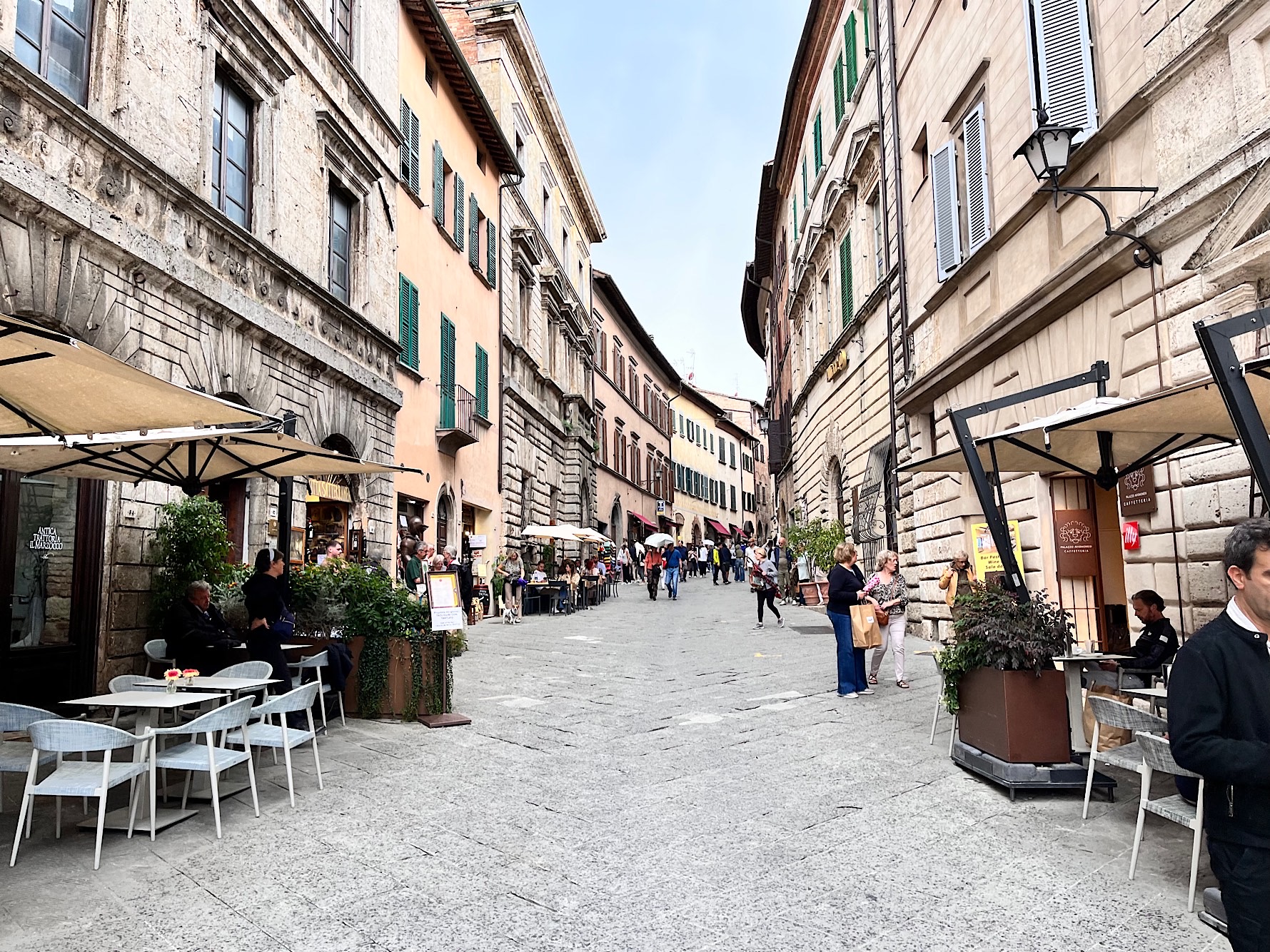In Montepulciano strömen wir mit Touristenhorden zum Dom hoch, werden vom Regen erwischt und sind froh, den Massen endlich auch wieder zu entkommen. Irgendwie sind wir noch nicht wieder städtetauglich.