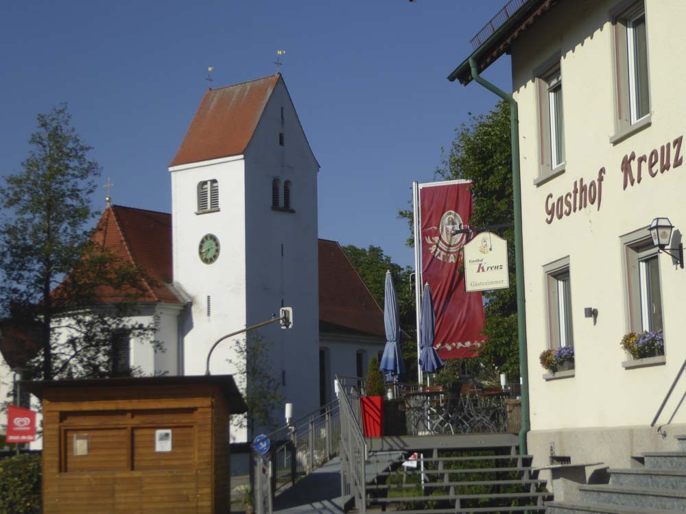 Entsprechend ist auch die Hotelsituation. Vieles ist ausgebucht, anderes so unverschämt teuer, dass wir ĂĽberhaupt keine Lust haben. Lindau haken wir mal ganz schnell ab, fahren aufs Land. Gasthaus eins und zwei sind ausgebucht, in einem völlig unscheinbaren Laden namens „Kreuz“ kriegen wir fĂĽr 90 Euro ein höchst mittelmässiges Zimmer im dritten Stock. Mit FrĂĽhstĂĽck. DafĂĽr ist das Abendessen auf der Biergarten genannten Terrasse saumässig. Und natĂĽrlich geht das wlan auch nicht. Juan ist so gefrustet, dass er tatsächlich noch einmal losfährt, um bei Lidl einen Prinzenrolle einzukaufen. FĂĽr den Fall, dass er noch Hunger bekommt…